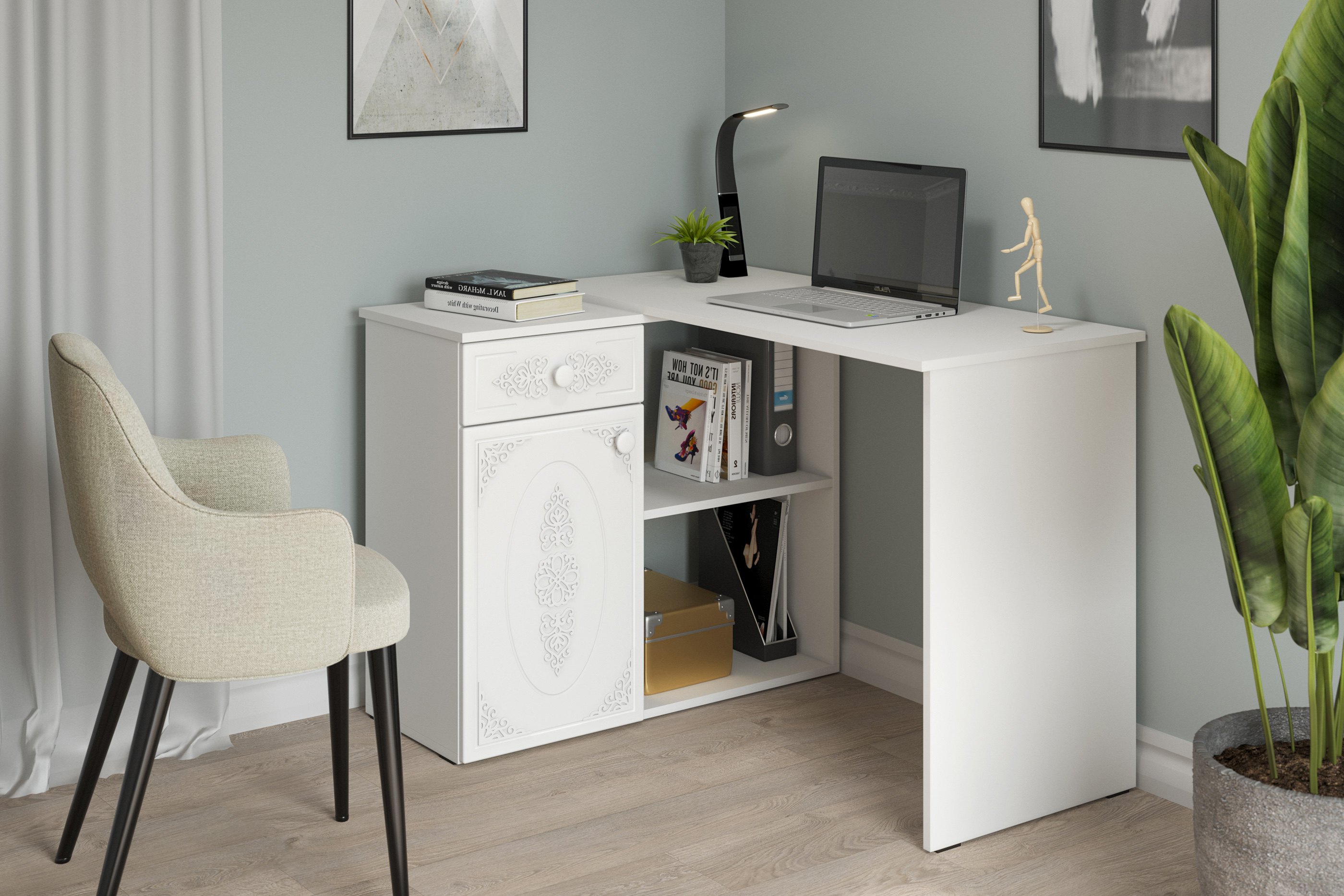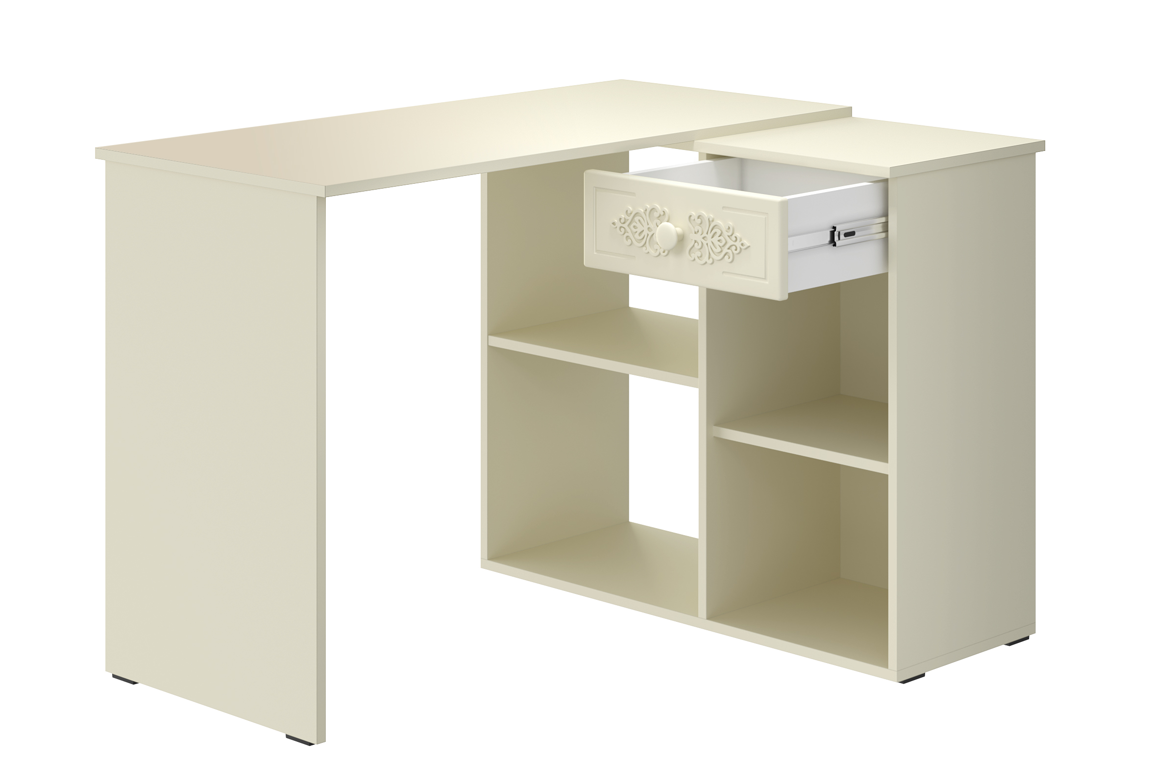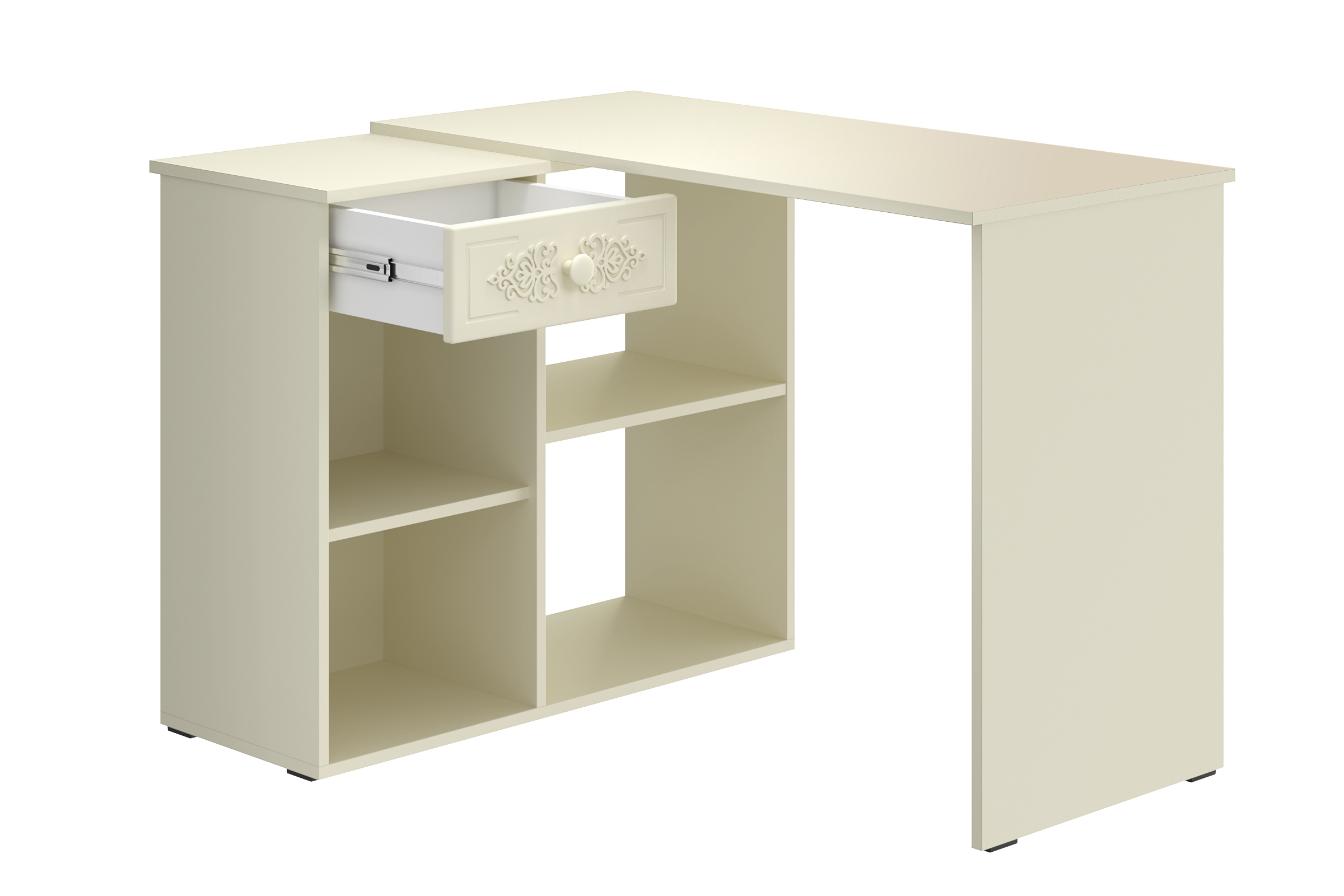 Угловой стол Ассоль АС-67 станет отличным местом для работы. В выдвижном ящике можно хранить блокнот, канцелярские принадлежности. Стильный дизайн позволит разместить в любом современной интерьере. Модуль может быть собран в зеркальном варианте "правым" или "левым". Фурнитура: телескопические направляющие полного выдвижения, петли с доводчиками.