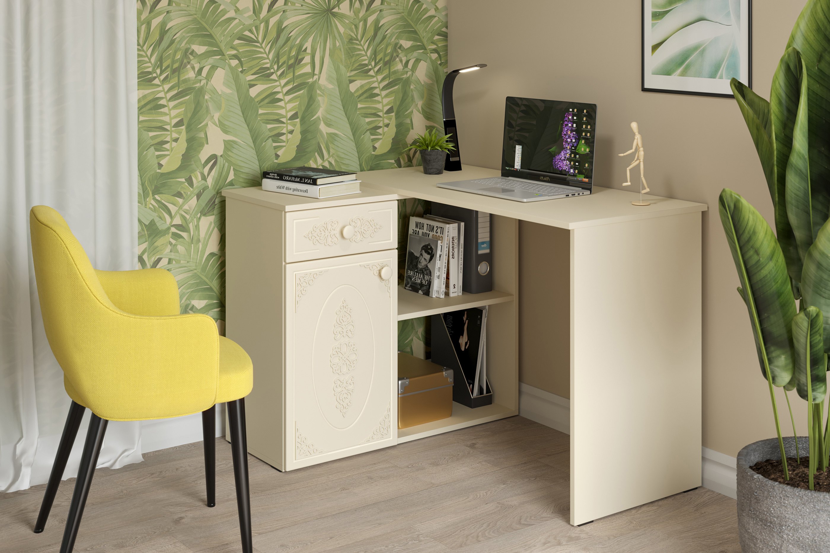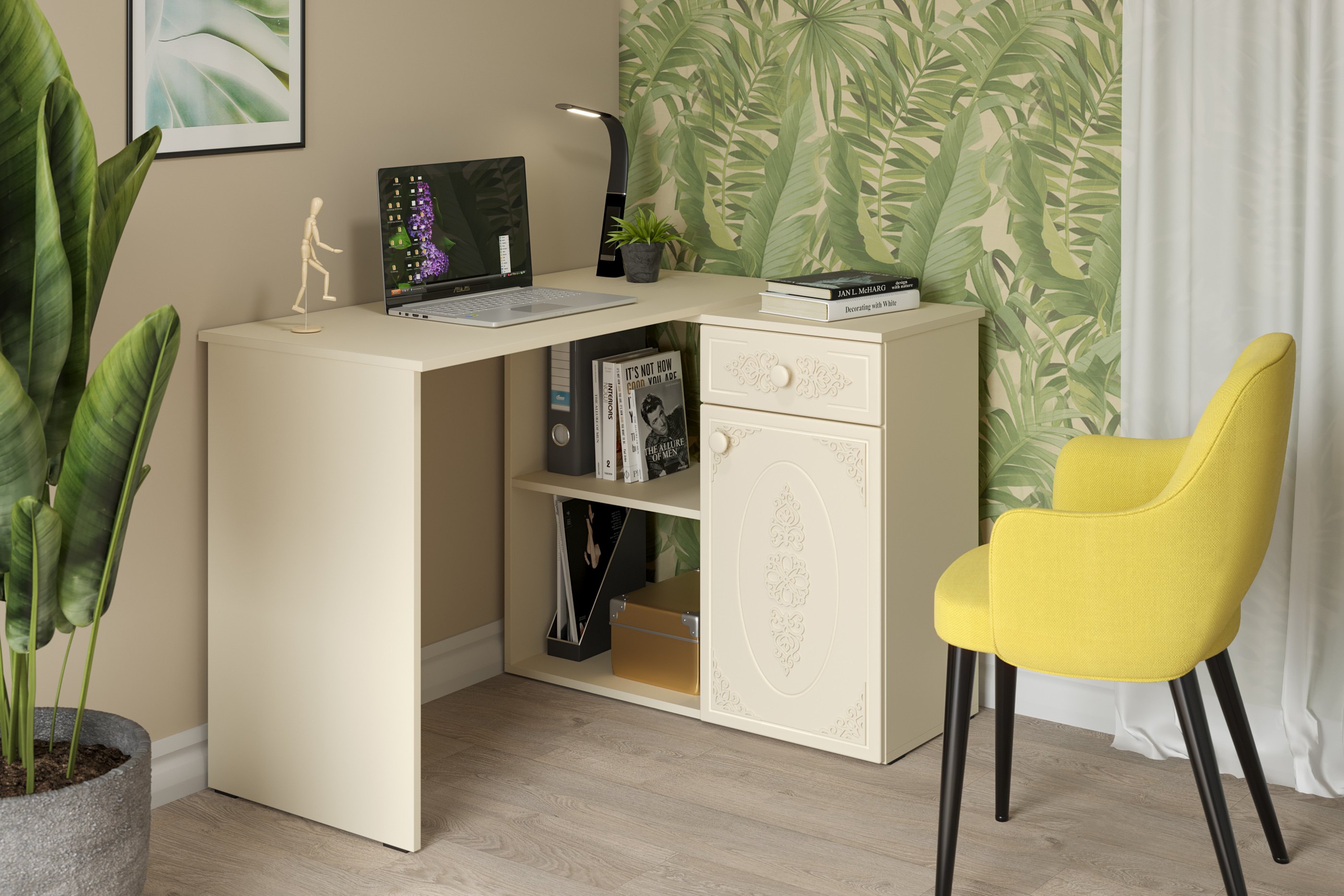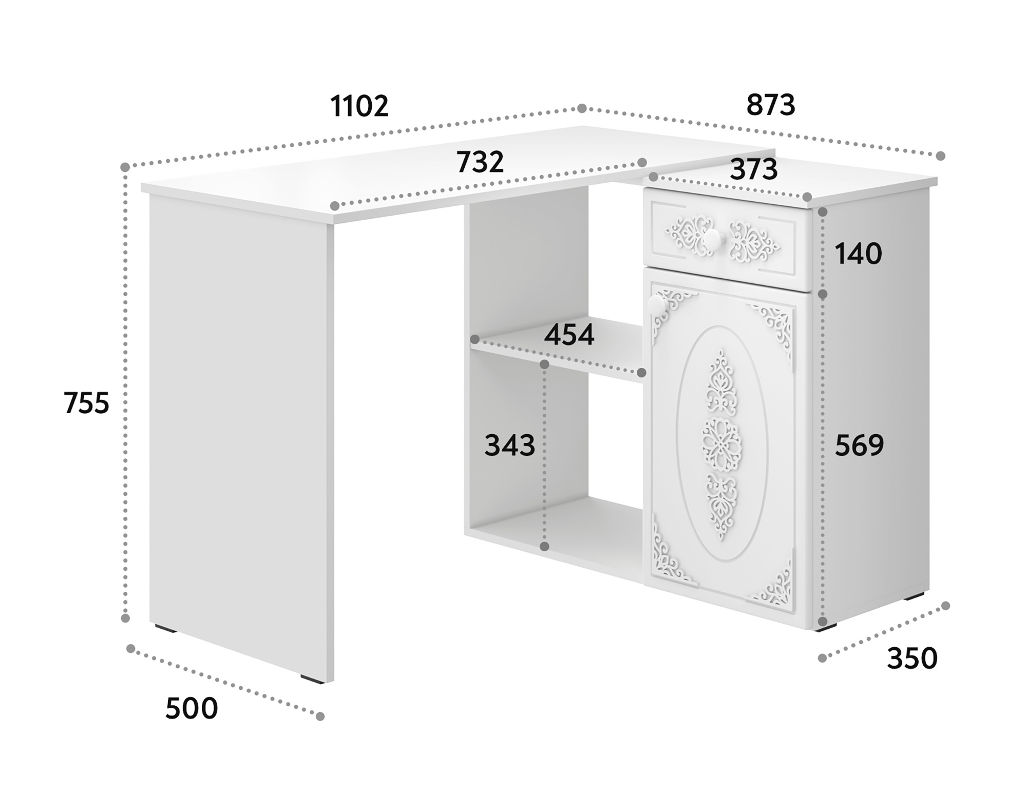 Угловой стол Ассоль АС-67 станет отличным местом для работы. В выдвижном ящике можно хранить блокнот, канцелярские принадлежности. Стильный дизайн позволит разместить в любом современной интерьере. Модуль может быть собран в зеркальном варианте "правым" или "левым". Фурнитура: телескопические направляющие полного выдвижения, петли с доводчиками.