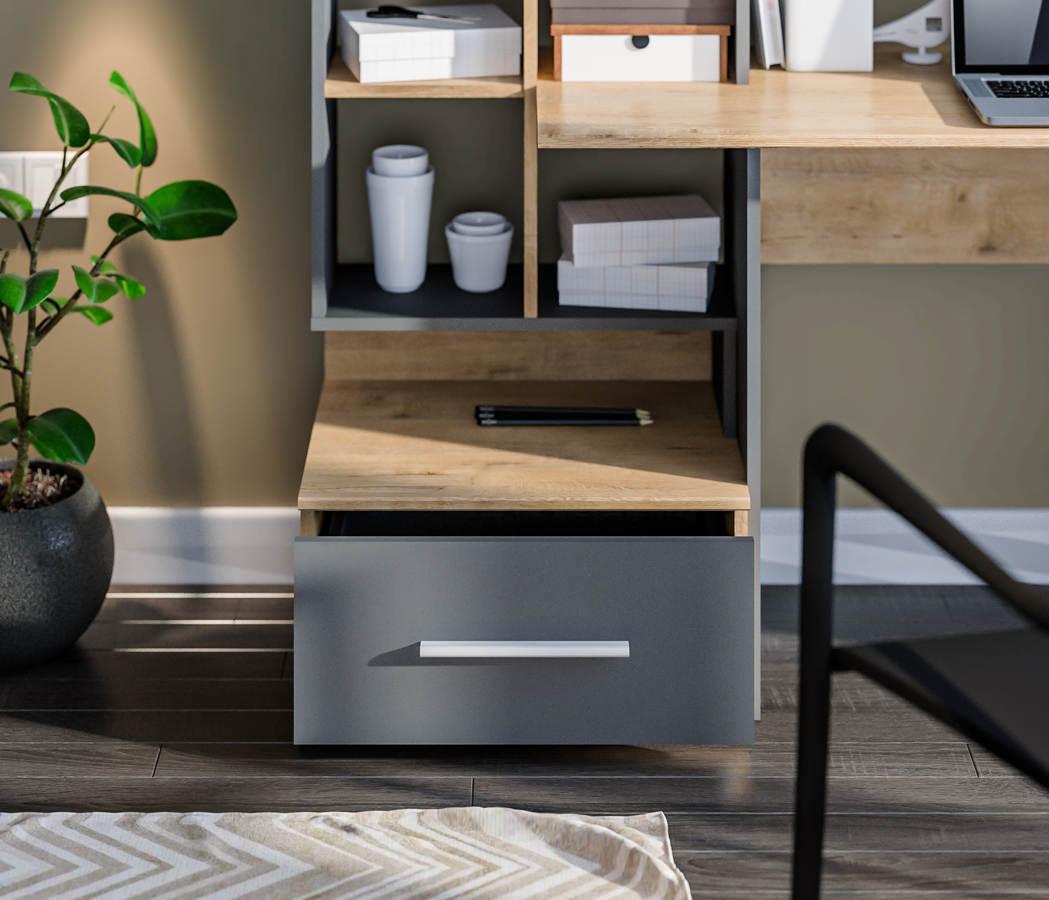 Стол Мамбо СБ-3339 – комфортное рабочее место, где предусмотрены отделения для хранения бумаг, книг, журналов. Он органично впишется в комнату школьника, студента, а также в кабинет. Габаритные размеры стола довольно просторные – ширина 148 см, высота 105 см и глубина 50 см. Рядом с рабочей поверхностью расположено вместительное отделение с полками и с ящиком.