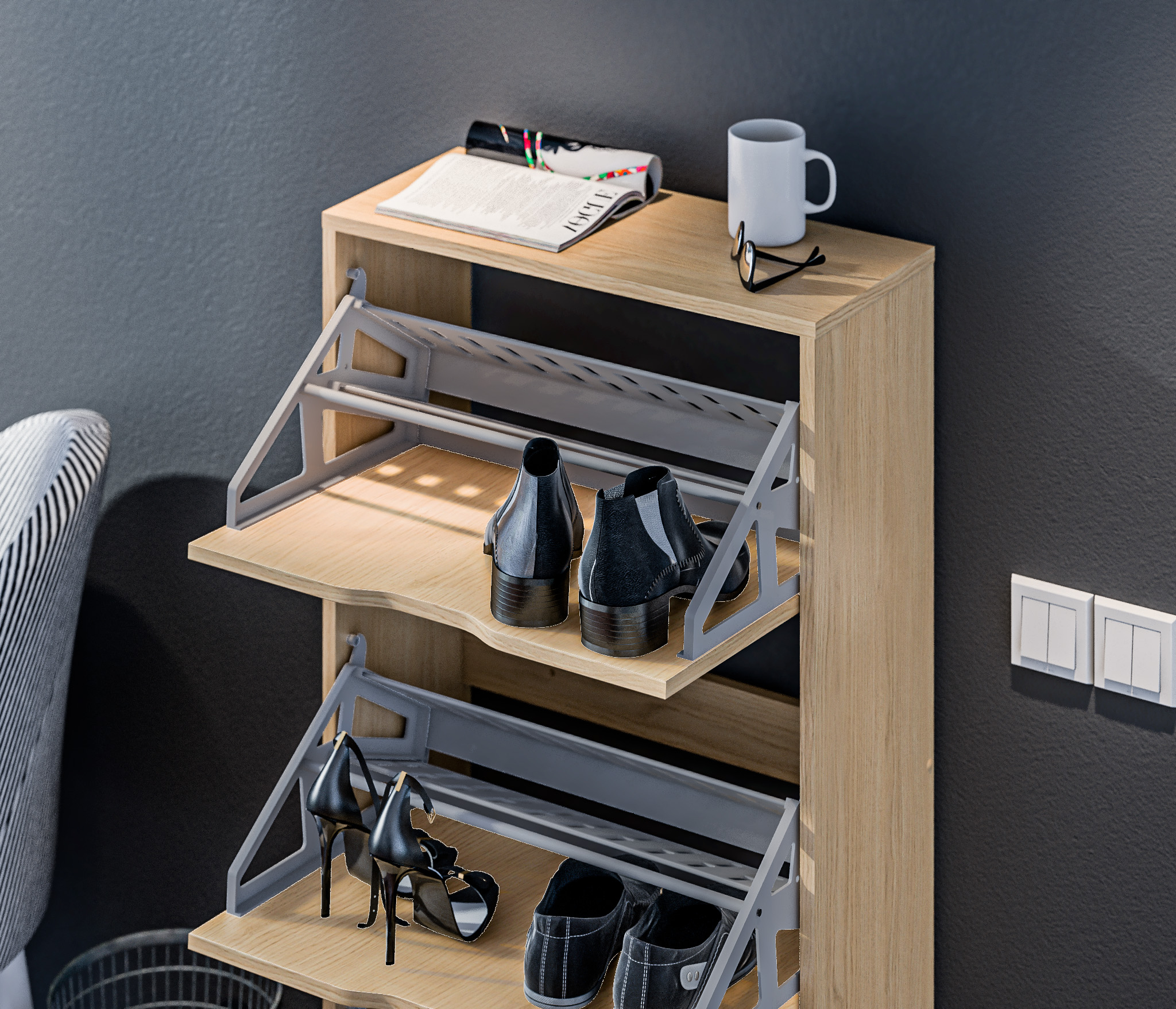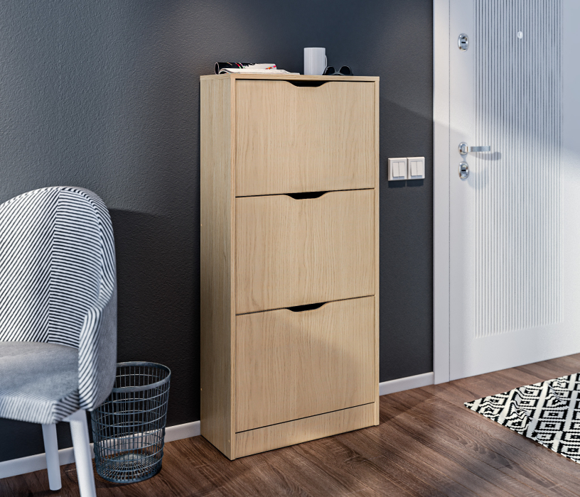 Габаритные размеры – ширина 59 см, высота 126 см и глубина 25 см. Обувница имеет три отделения, каждое из которых оснащено специальными стойками для хранения обуви. Прорезные ручки и строгие геометрические формы позволяют вписать обувницу в любой интерьер. Обувница произведена из экологичного прочного КДСП, устойчивого к мелким механическим повреждениям.