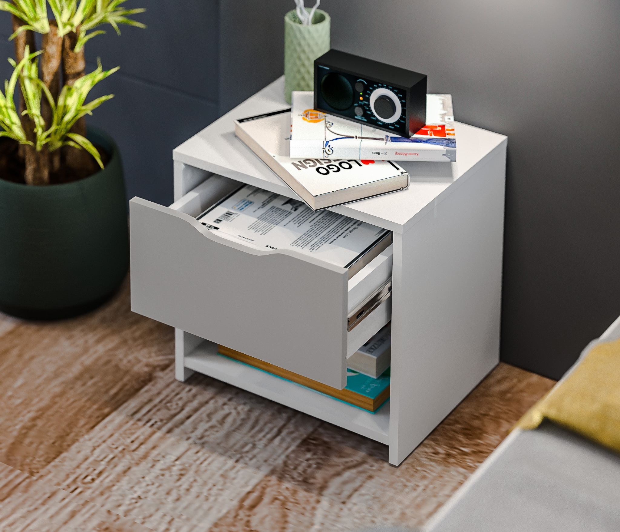 Прикроватная тумба Mika / Мика СБ-3284 станет идеальным дополнением к кровати из модульного гарнитура Мика. Выполненная в современном минималистичном дизайне, тумба может быть и самостоятельным предметом интерьера. Габаритные размеры довольно компактны – ширина 43 см, высота 42 см, глубина 35 см. Конструктивно тумба состоит из одного открытого отделения и одного вместительного выдвижного ящика. На основании тумбы есть протекторы, которые защитят пол от повреждения. Материал корпуса – ЛДСП с отделкой в цвете «Белый Альпийский». Фасады также из ЛДСП с комбинированной отделкой в цветах «Белый Альпийский» и «Серый перламутровый».