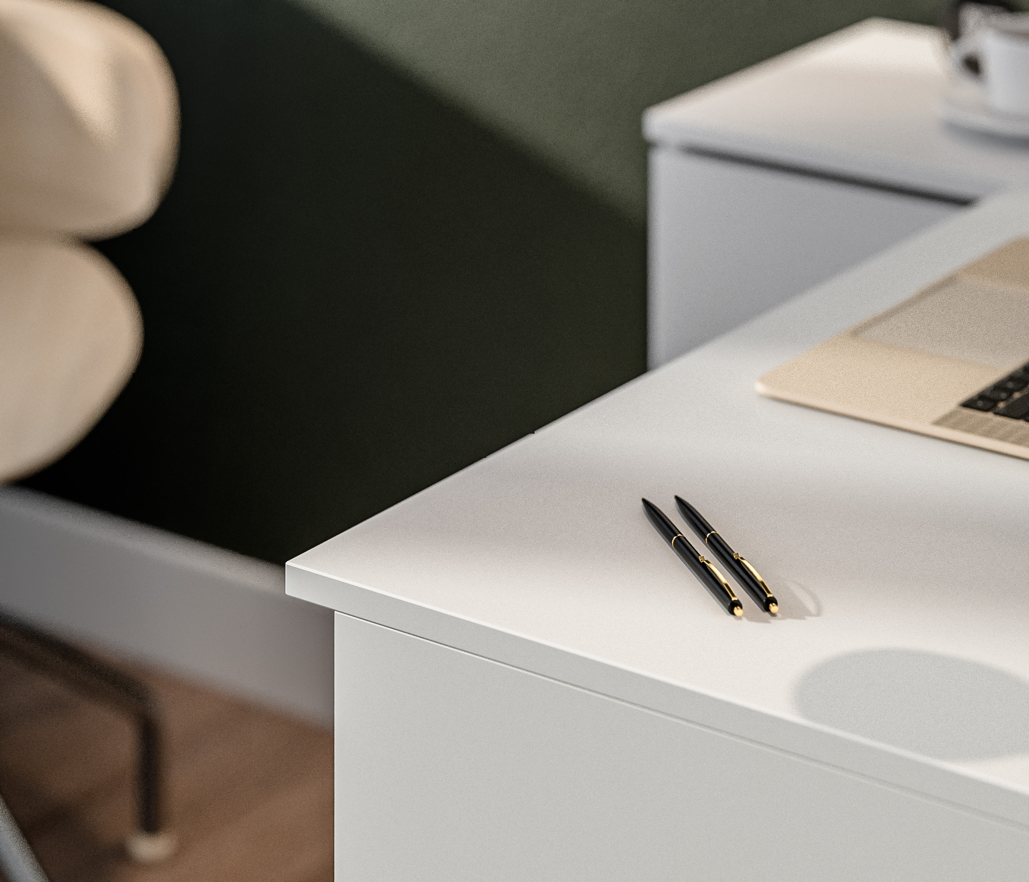 Габаритные размеры – ширина 119 см, высота 75 см и глубина 80 см. Под рабочей поверхностью расположена тумба с открытыми вместительными полками, а также выдвижной ящик и закрытое отделение с отдельной дверцей. Стол произведен из современного экологичного ЛДСП. Возможен как левый, так и правый вариант сборки.