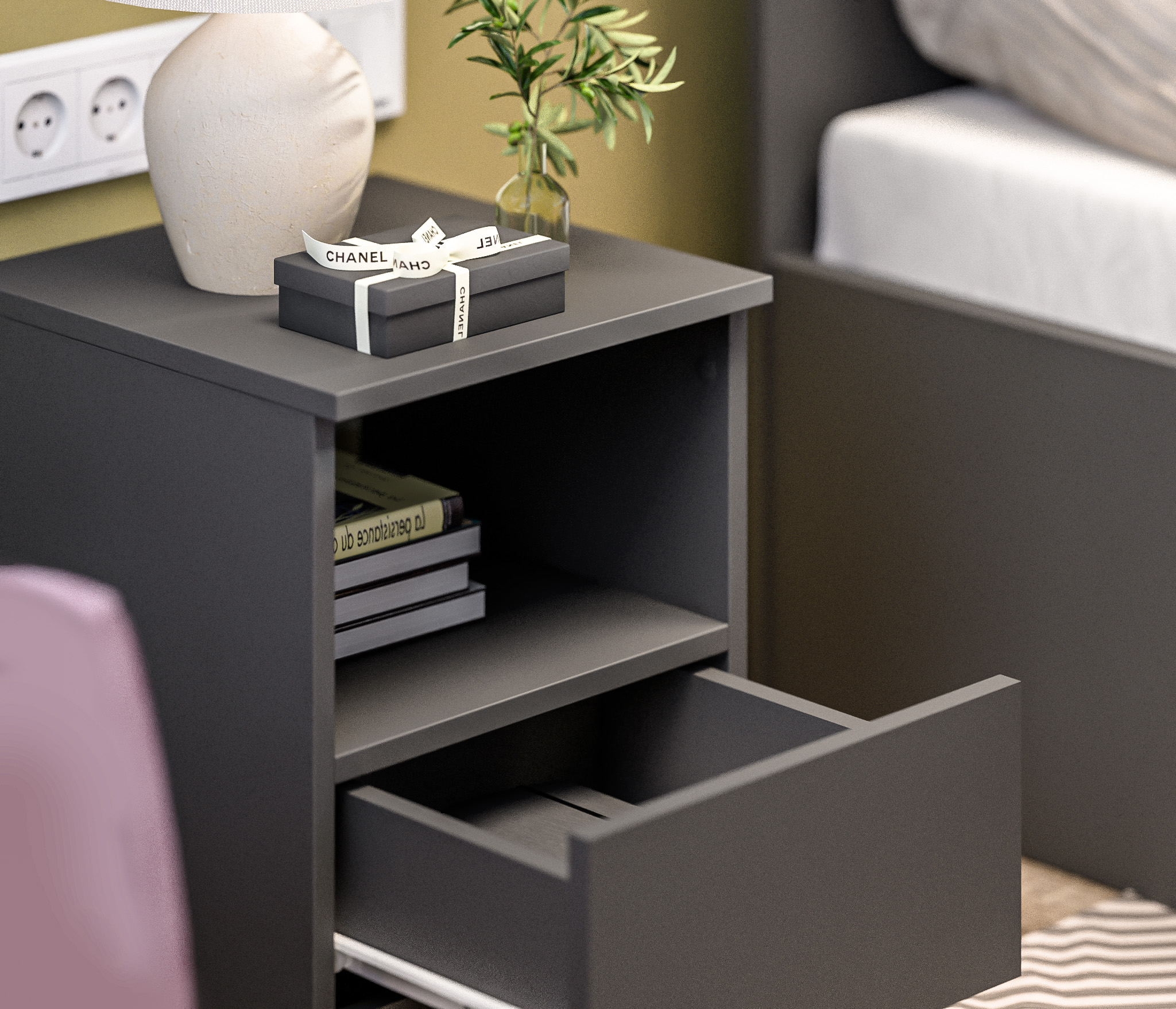 При компактных габаритных размерах – ширина 35 см, высота 44,4см и глубина 35,3 см, тумба довольно вместительная. Под столешницей расположены открытая полка и выдвижной ящик, куда можно положить планшет или книгу.