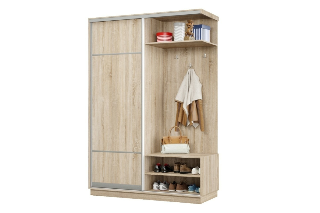 В прихожей используется одна дверь, которая перемещается по однополосному треку вправо или влево, закрывая или открывая каждую из двух частей шкафа.
