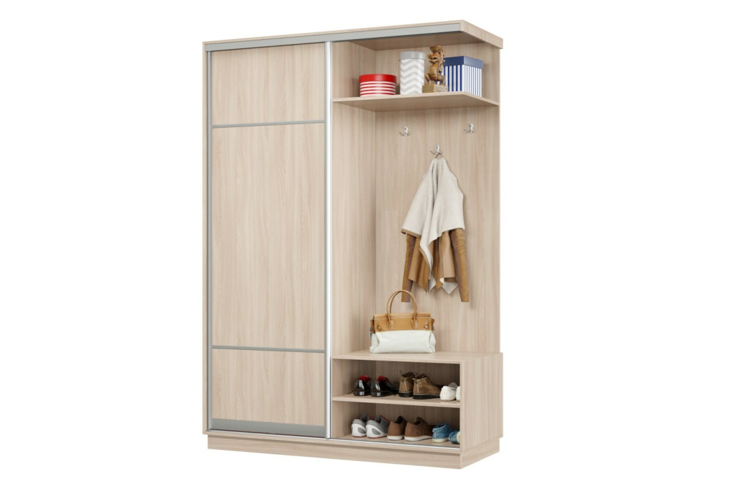В прихожей используется одна дверь, которая перемещается по однополосному треку вправо или влево, закрывая или открывая каждую из двух частей шкафа.