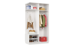 Дверь делит шкаф на 2 равные части: отделение для верхней одежды и отделение с полками и крючками.