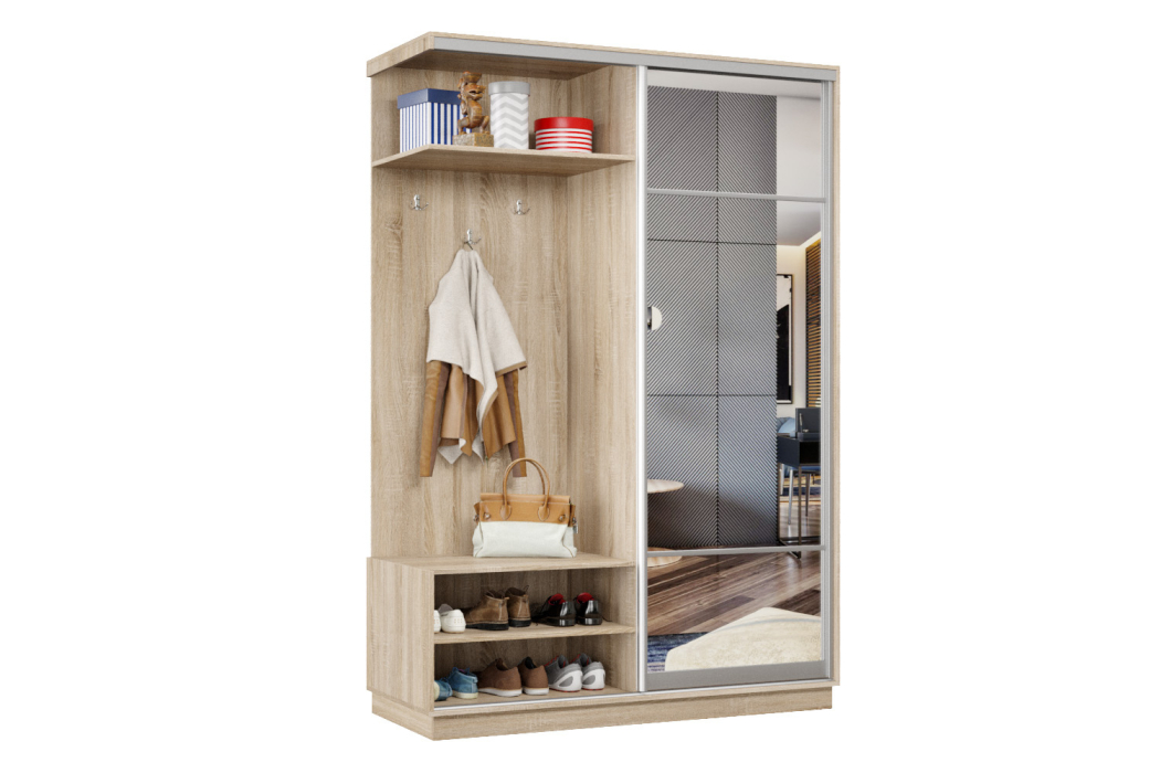 За счет применения системы купе прихожая отлично зарекомендовала себя в узких коридорах, где распашная дверь ограничивает пространство. Несмотря на небольшие габариты, прихожая-купе получилась функциональной и практичной.
