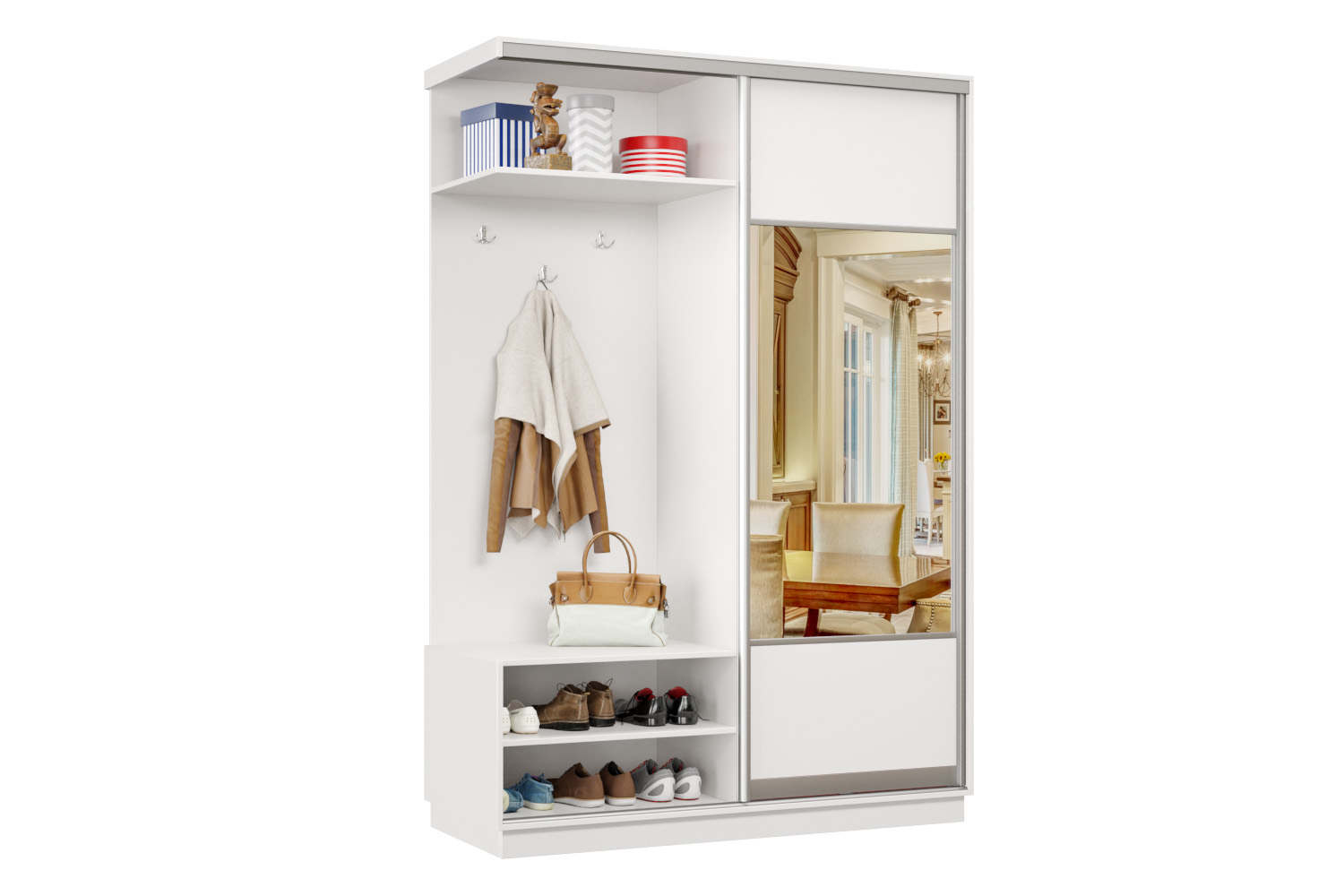 В прихожей используется одна дверь, которая перемещается по однополосному треку вправо или влево, закрывая или открывая каждую из двух частей шкафа.