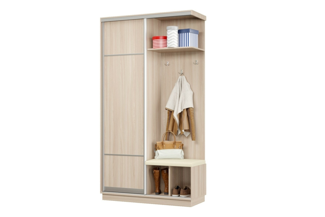 В прихожей используется одна дверь, которая перемещается по однополосному треку вправо или влево, закрывая или открывая каждую из двух частей шкафа.