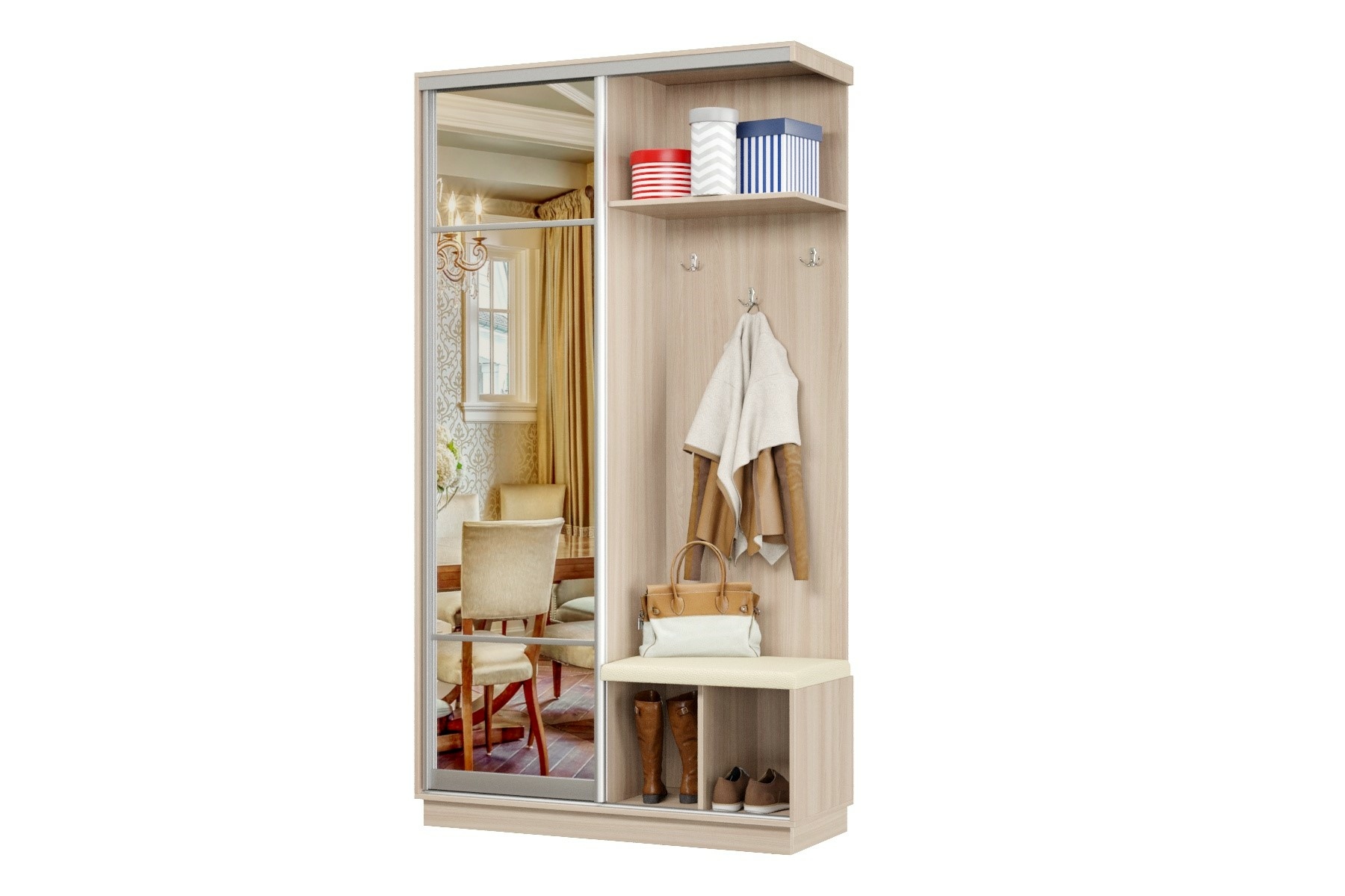 В прихожей используется одна дверь, которая перемещается по однополосному треку вправо или влево, закрывая или открывая каждую из двух частей шкафа.
