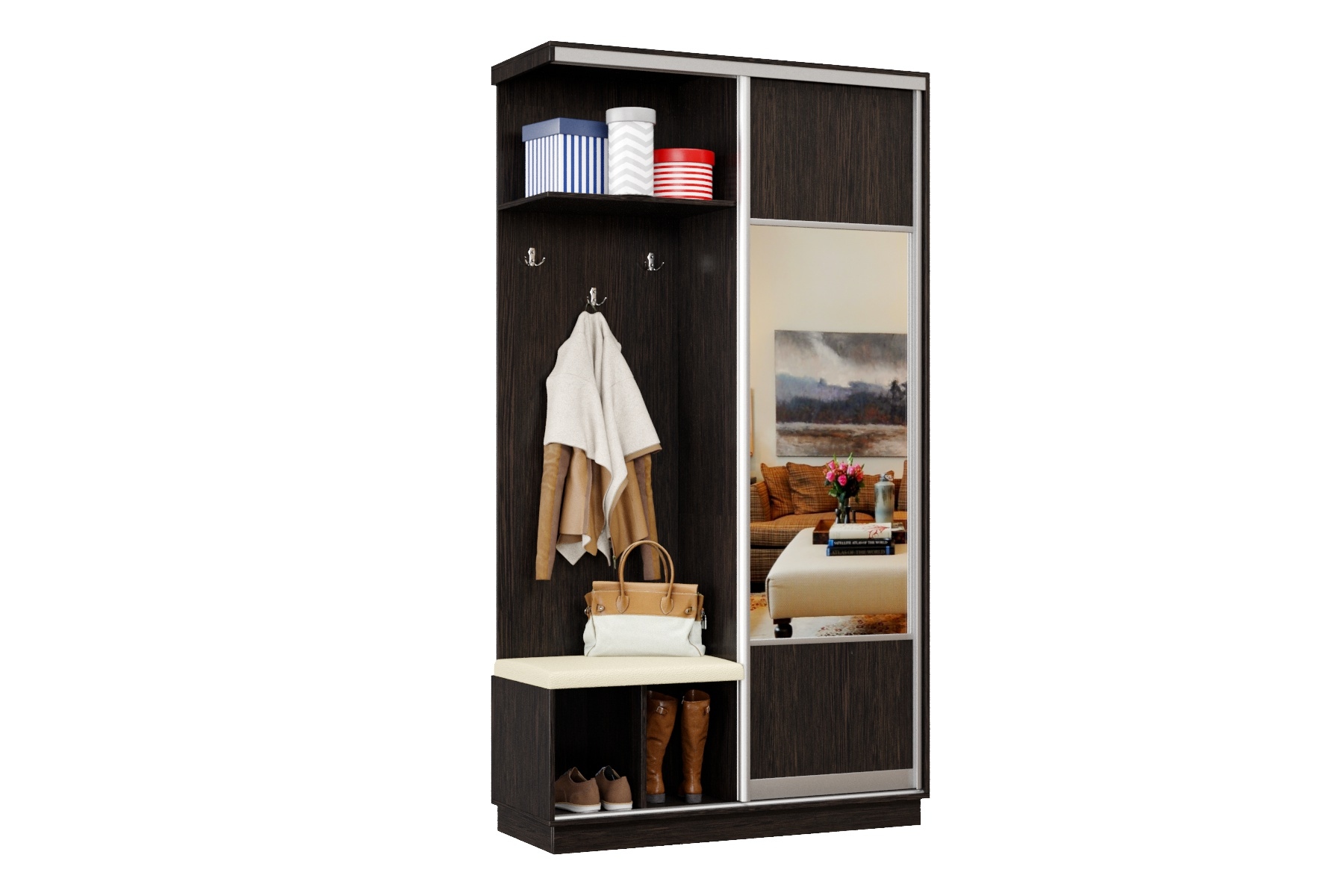 В комплекте 3 крючка для одежды. Используется штанга для одежды. Максимальная нагрузка до 12 кг. Задняя стенка - ДВП белая облагороженная.