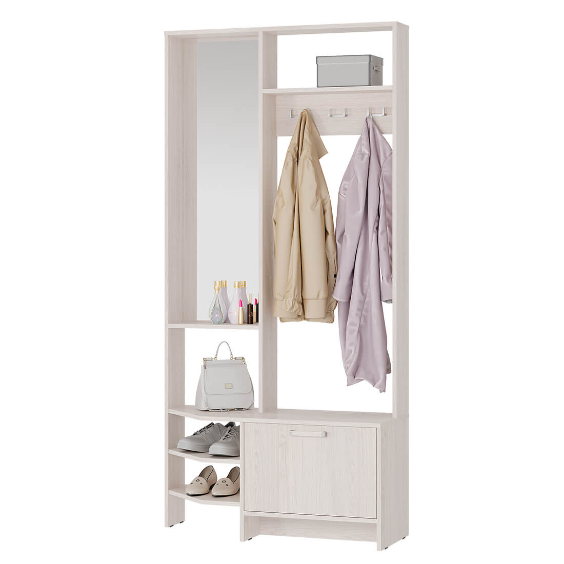 Большое зеркало, открытая верхняя полка для головных уборов и сезонных аксессуаров, крючки для верхней одежды, а также закрытая тумба-обувница и комплект полок для домашней обуви – все, что нужно для Вашего комфорта в прихожей.