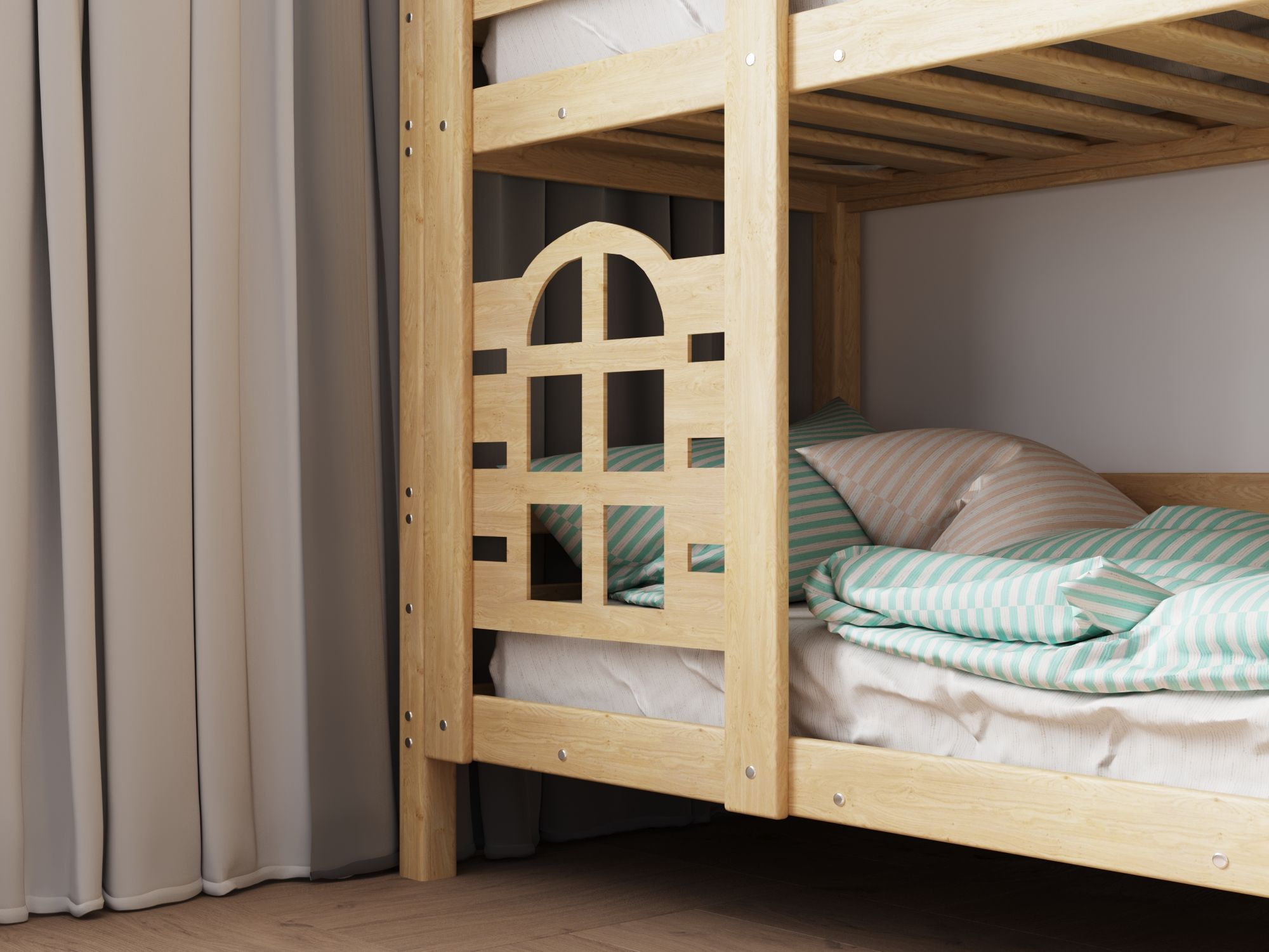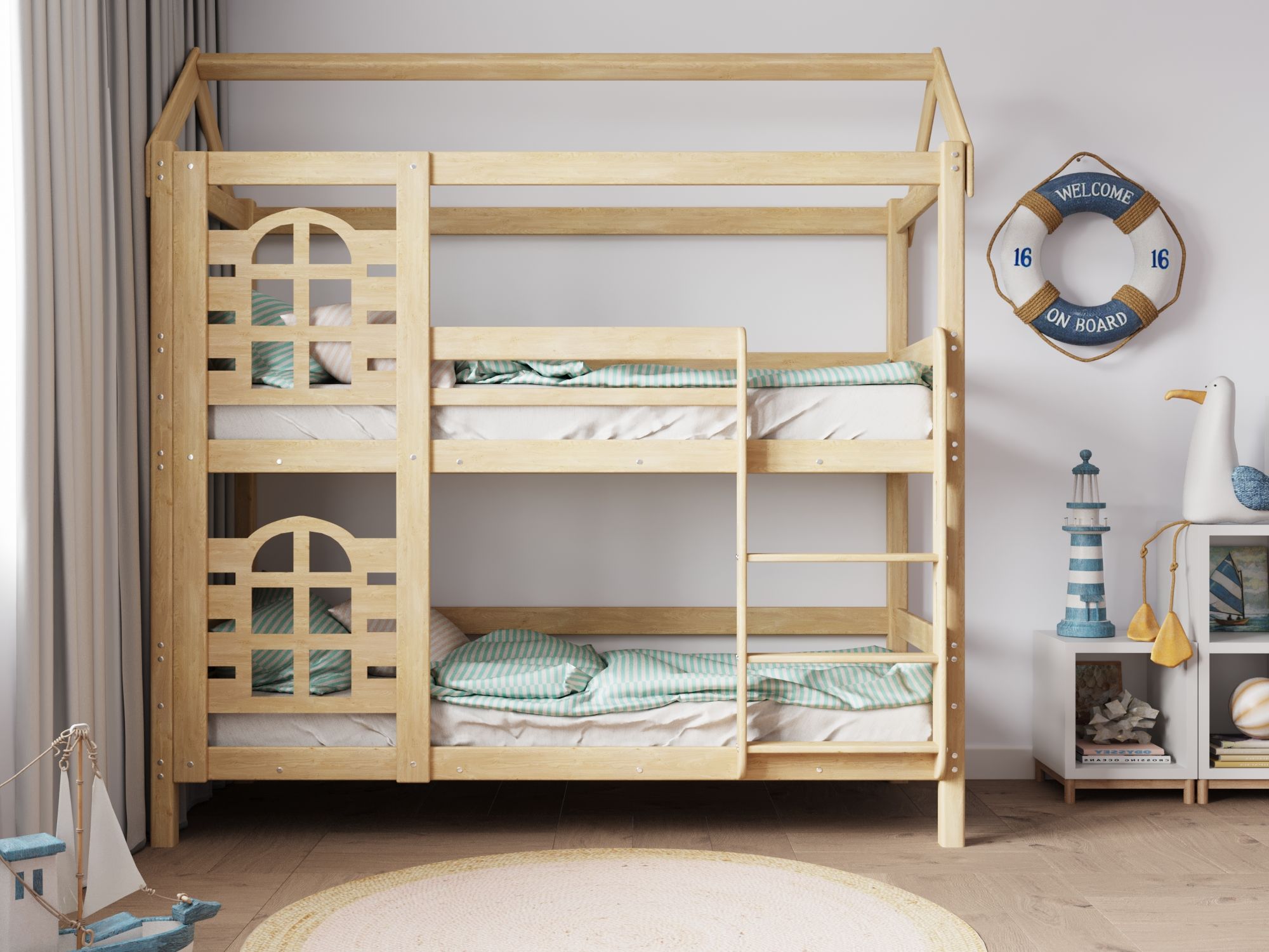 Модель двухъярусной кровати домика «Baby Lux» производится из массива натурального дерева без какого либо использования пропиток, лаков и красок, поэтому имеет высокую экологическую безопасность.