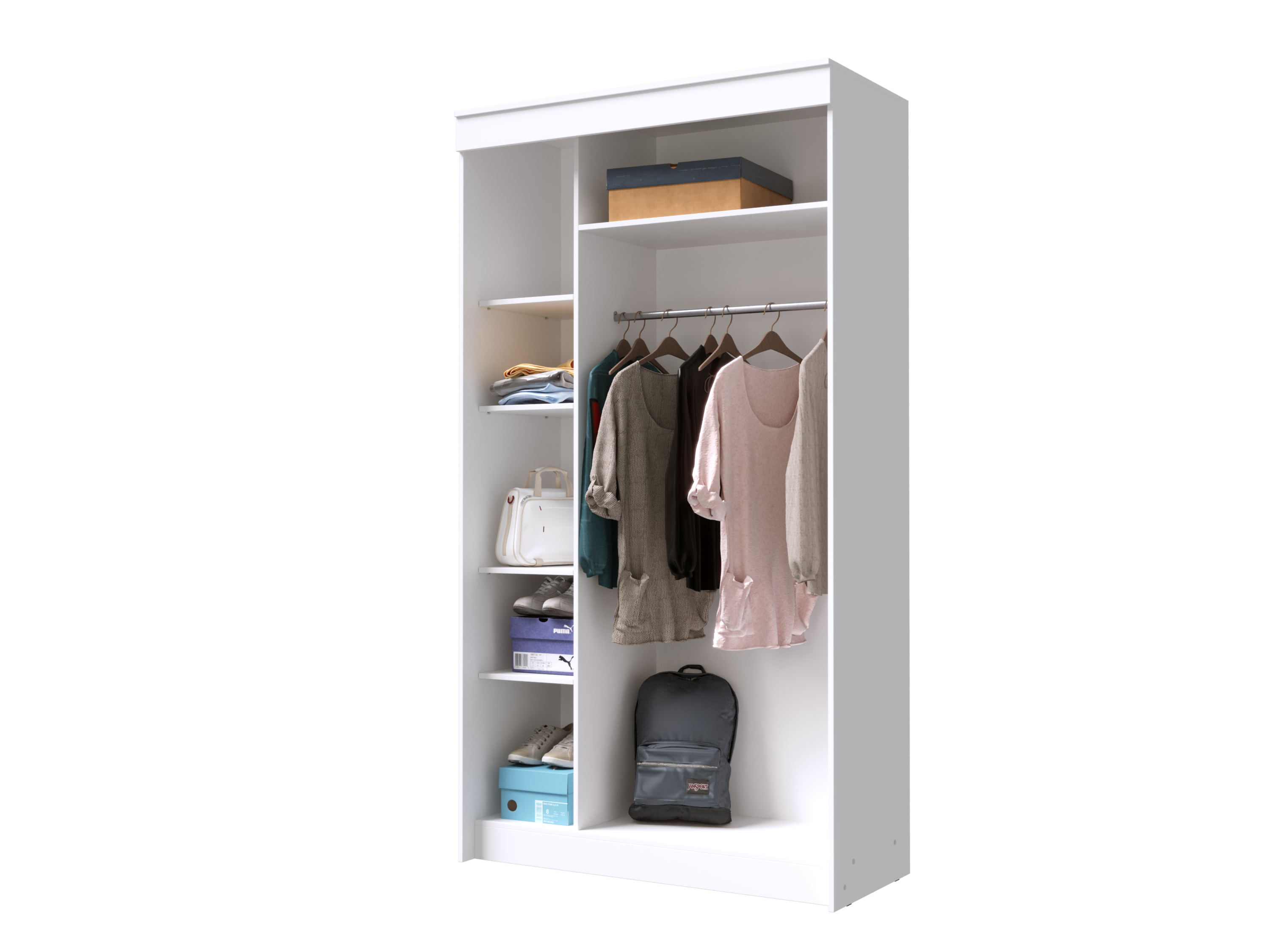 Внутри есть большое отделение со штангой для плечиков и поменьше — с полками. Центральный фасад шкафа-купе оформлен зеркальным полотном во весь рост, которое сделает пространство визуально больше.