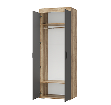 Новая модульная коллекция Прима в актуальном декоре дуб каньон/графит удачно впишется в современную обстановку Вашей квартиры и позволит организовать грамотное хранение вещей в гостиной и спальне. Приятный древесный оттенок корпуса гармонично дополнен матовым графитом, в котором исполнены фасады. Шкаф для одежды и белья Прима оснащен широкой продольной штангой для деликатной одежды на плечиках и двумя полками. Размеры: 80.2 х 217.6 х 51 Особенности