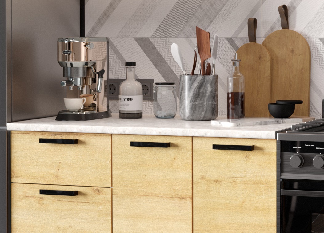 Глубина нижних шкафов: без дверок — 400 мм, с дверцами — 420 мм.