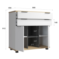 Комод имеет два широких выдвижных ящика и два ящика с дверцами. Две открытые ниши могут быть использованы для хранения вещей или игрушек.