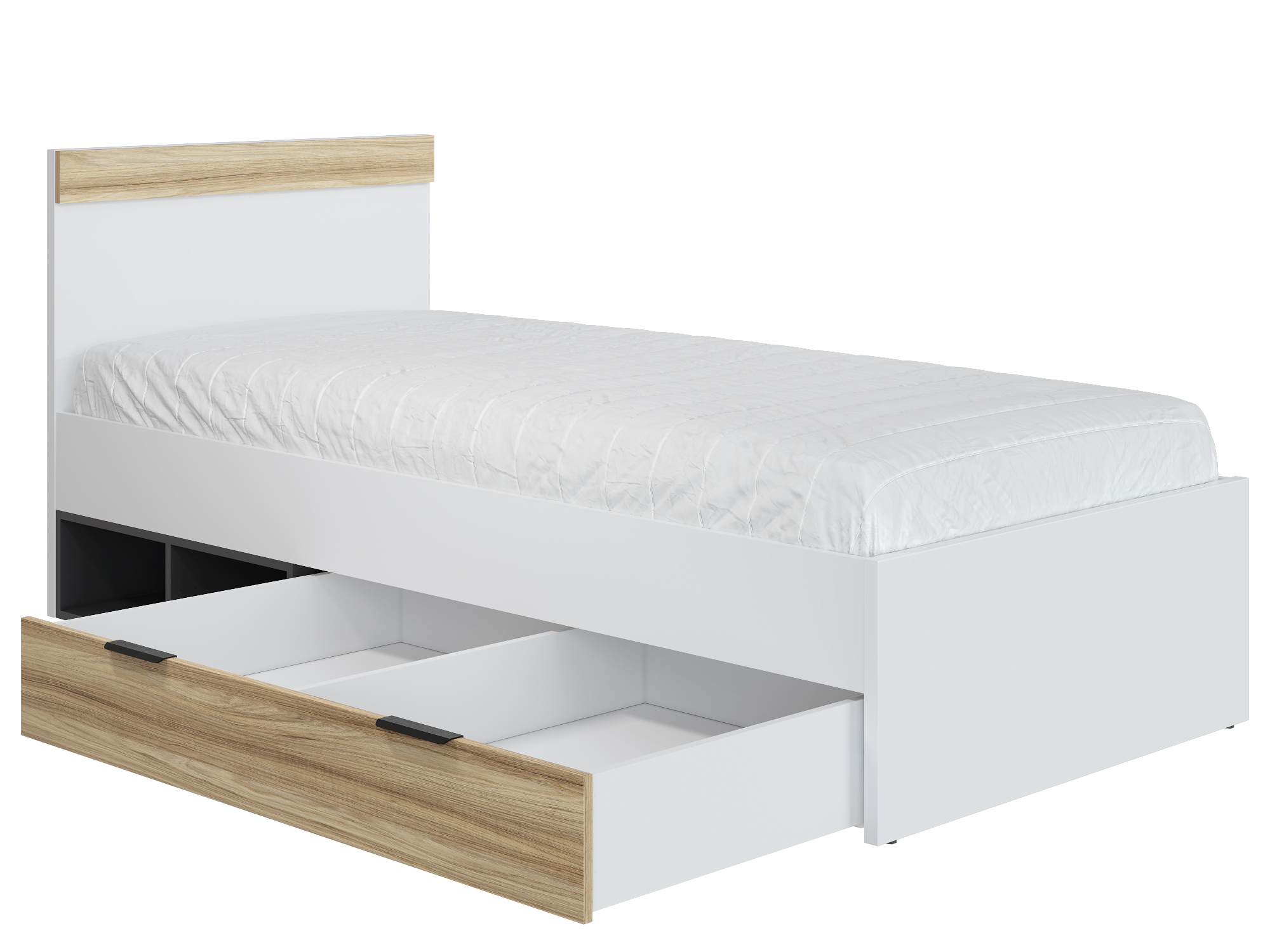 Кровать односпальная Скайлайт СЛ-32 идеальна для детской и подростковой комнаты. Кровать имеет высокое изголовье. Высота изножья 400 мм. Фасады и царги изготовлены из ЛДСП 16 мм. Кровать имеет один выкатной ящик глубиной 766 мм для хранения вещей, игрушек или постельного белья. Две дополнительных ниши в цвете серый графит могут быть использованы для хранения вещей, игрушек и книг.