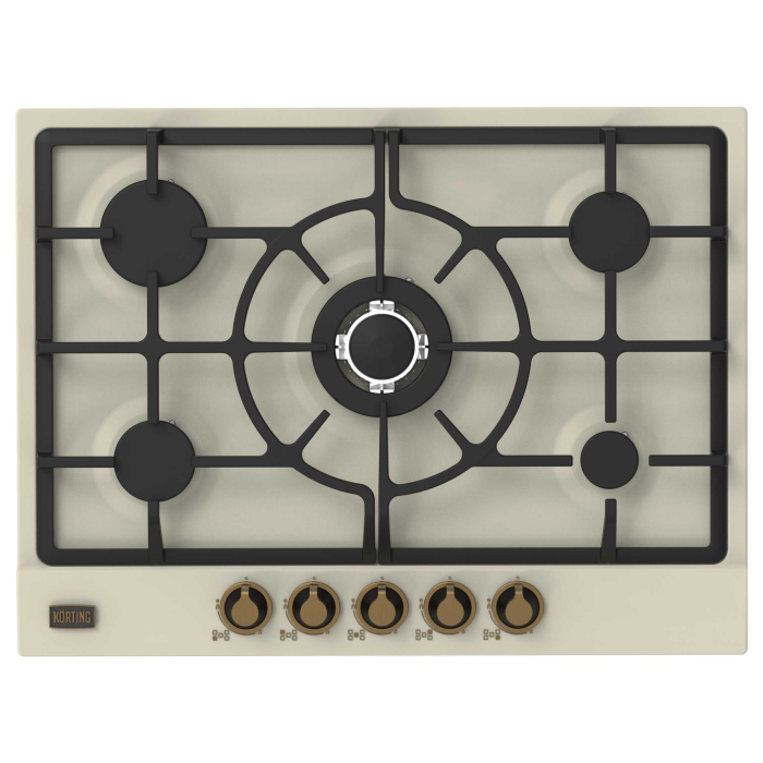Газовая варочная панель 70 см в ретро-дизайне, 5 высокоэффективных конфорок, сверхмощная конфорка WOK 3,8 кВт, автоматический электроподжиг, газ-контроль каждой конфорки, чугунные решетки, металлический шильд с логотипом Korting, в комплекте - чугунная подставка WOK и адаптер для кофейника, цвет - слоновая кость, цвет регуляторов - бронза.