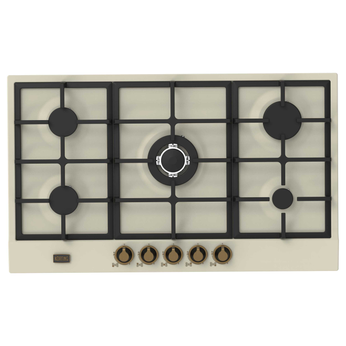 Газовая варочная панель 90 см в ретро-дизайне, 5 высокоэффективных конфорок, сверхмощная конфорка WOK 3,8 кВт, автоматический электроподжиг, газ-контроль каждой конфорки, чугунные решетки, металлический шильд с логотипом Korting, в комплекте - чугунная подставка WOK и адаптер для кофейника, цвет - слоновая кость, цвет регуляторов - бронза.