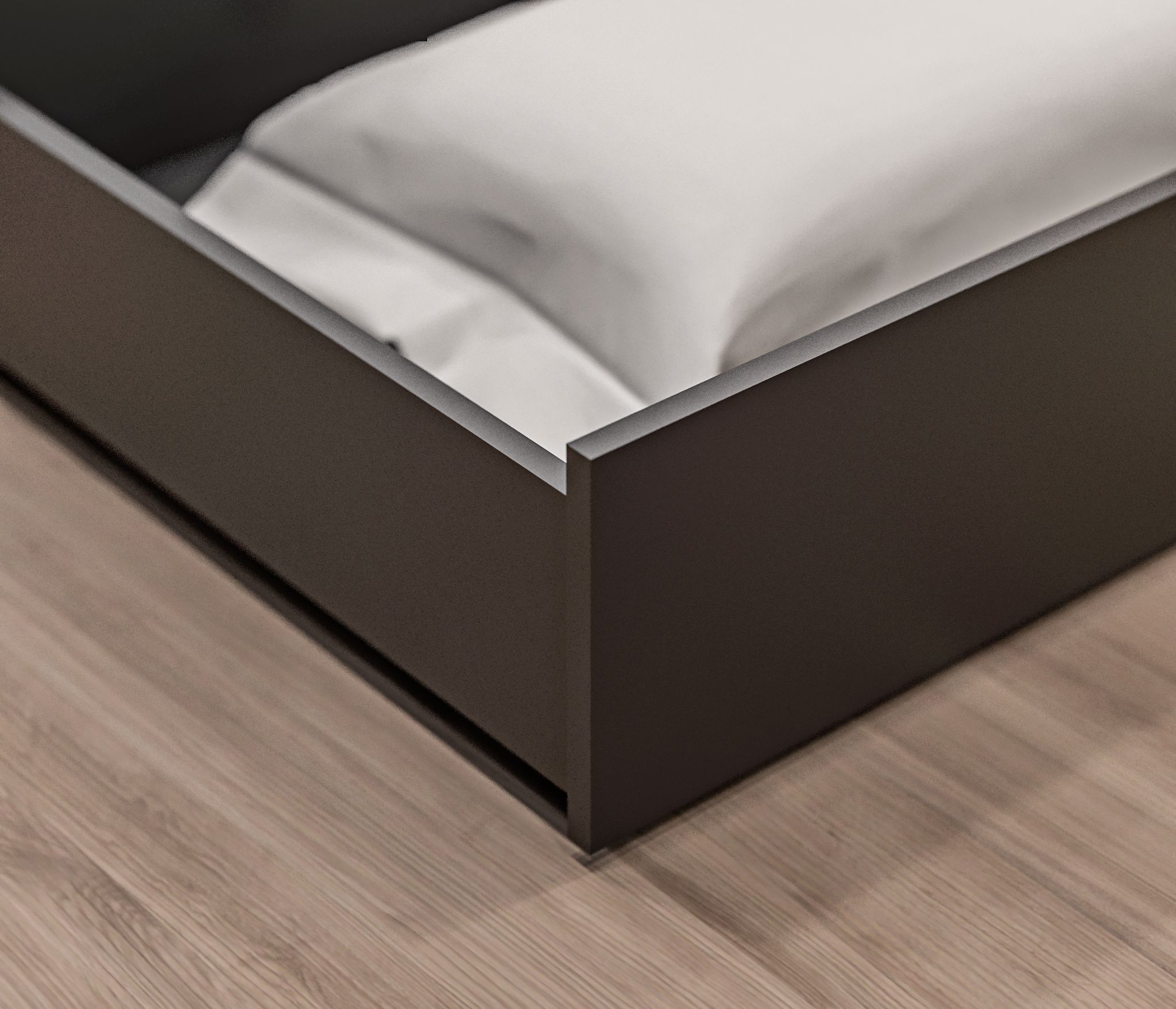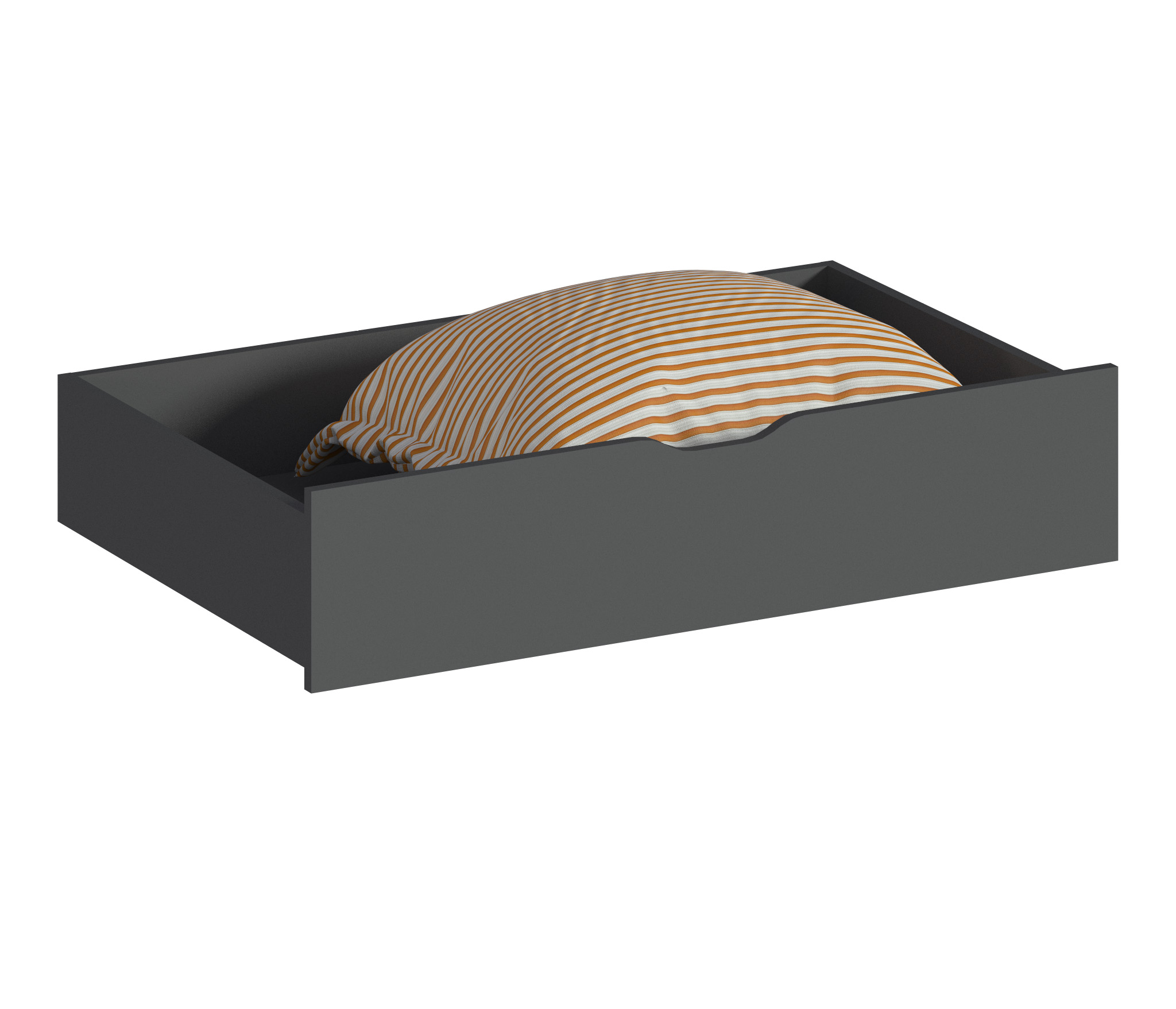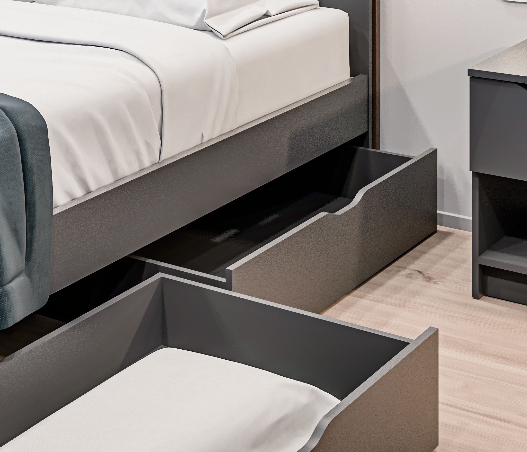 Ящик легко выдвигается и скрывается под кроватью, не занимая лишнего места. Он представляет собой удобное решение для хранения, позволяющее максимально использовать пространство в спальне.