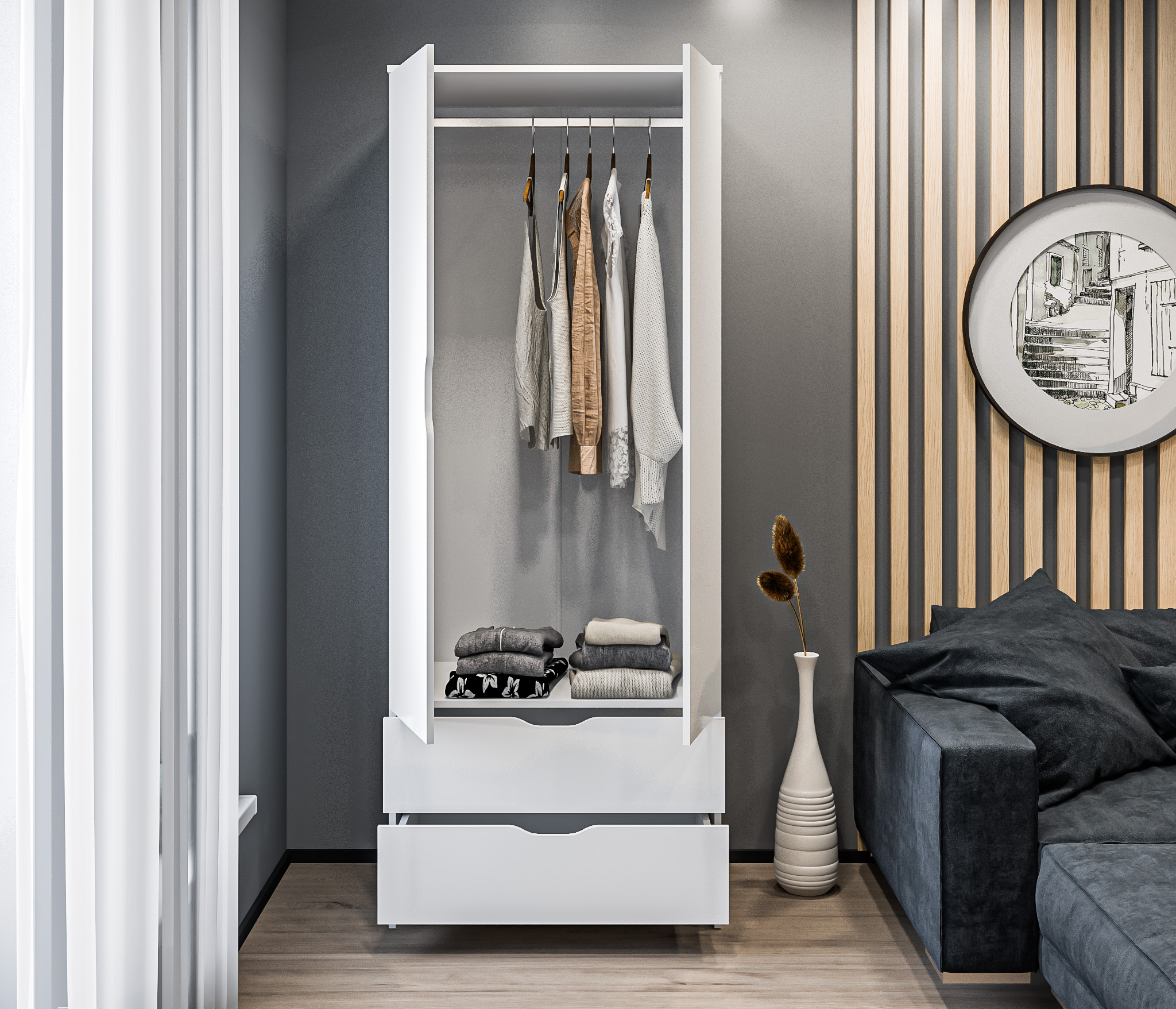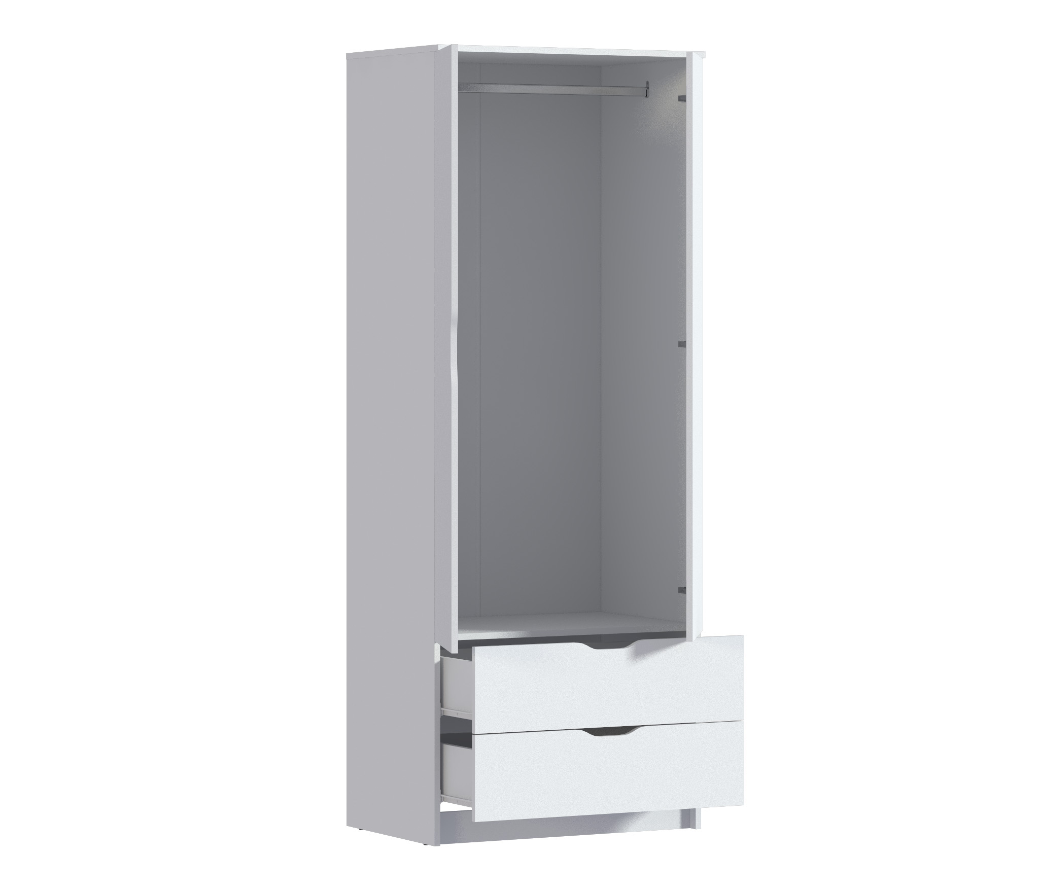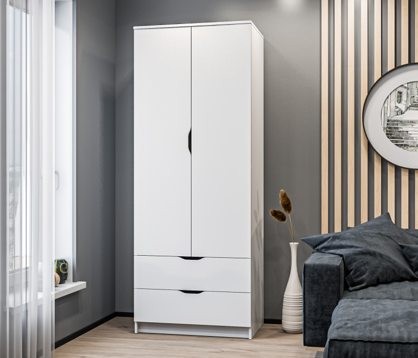 Внутри шкафа вы найдете два удобных ящика, которые помогут вам организовать мелкие предметы и аксессуары. Ящики легко выдвигаются и закрываются, обеспечивая удобный доступ к вашим вещам.