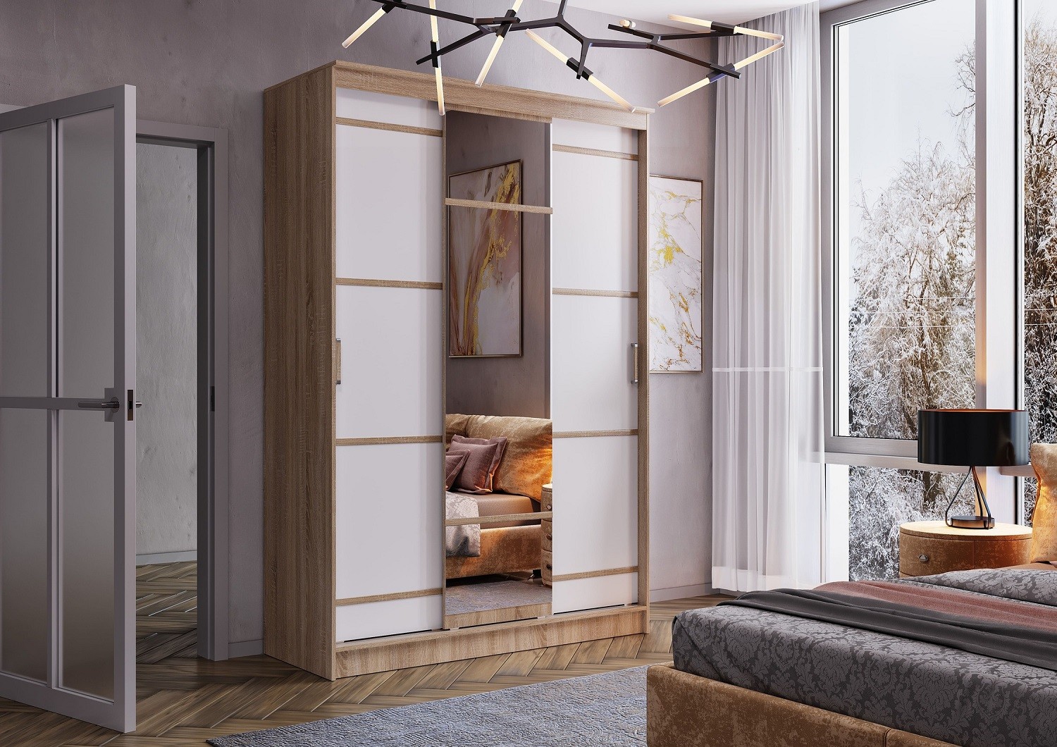 Большой, эргономичный шкаф-купе Сакура в трендовом декоре "дуб сонома/белый" будет гармонично смотреться в современном интерьере иотлично впишется в обстановку спальни или прихожей. Система открывания дверей "купе" экономит пространство перед шкафом, а приятный декор с имитацией текстуры натурального дерева, геометрическим рисунком и зеркало визуально расширяют пространство. Наполнение шкафа - продольная штанга и комплект полок.