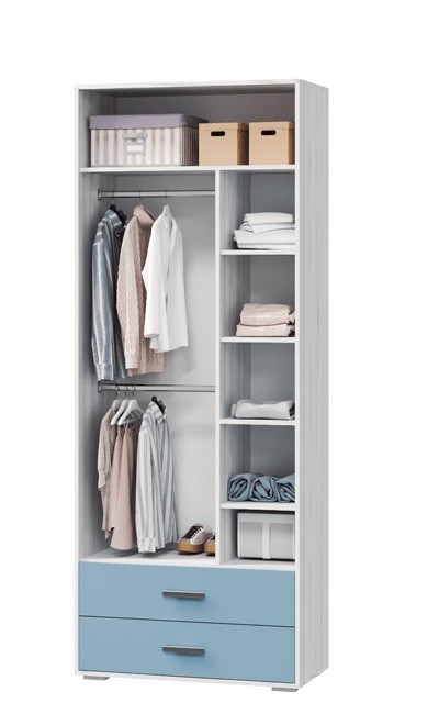 Двухдверный шкаф для одежды из коллекции Стич - универсальный вариант организации хранения в детской комнате мальчика. Благодаря разноплановому наполнению модуля всем вещам маленького героя хватит места. Продольные штанги пригодятся для одежды на плечиках, а комплект полок - для вещей в сложенном виде. Два вместительных ящика на шариковых направляющих Вы можете использовать для деликатных вещей, постельного белья и аксессуаров.