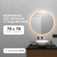 Безрамное зеркало круглой формы с контурной (тыльной) тёплой подсветкой, свет 3000К. Подложка из высококачественного МДФ, светодиодная лента защищена матовым свето-рассеивателем от попадания пыли и влаги. Есть вывод 220W для подключения к сети (блок питания подсветки 12V), включение подсветки от выключателя на стене, либо от розетки.