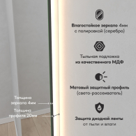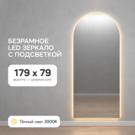 Безрамное арочное зеркало с контурной (тыльной) тёплой подсветкой, свет 3000К. Подложка из высококачественного МДФ, светодиодная лента защищена матовым свето-рассеивателем от попадания пыли и влаги. Есть вывод 220W для подключения к сети (блок питания подсветки 12V), включение подсветки от выключателя на стене, либо от розетки.