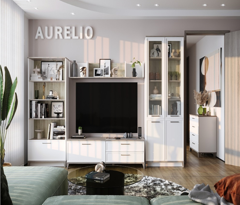 Модульная коллекция Аурелио – воплощение лучших черт классики в современном исполнении. Корпус мебели выполнен из высококлассного ЛДСП, фасад – МДФ в профиле. Рамочные фасады шкафов выглядят изысканно в сочетании со стеклом и металлическими черными ручками.