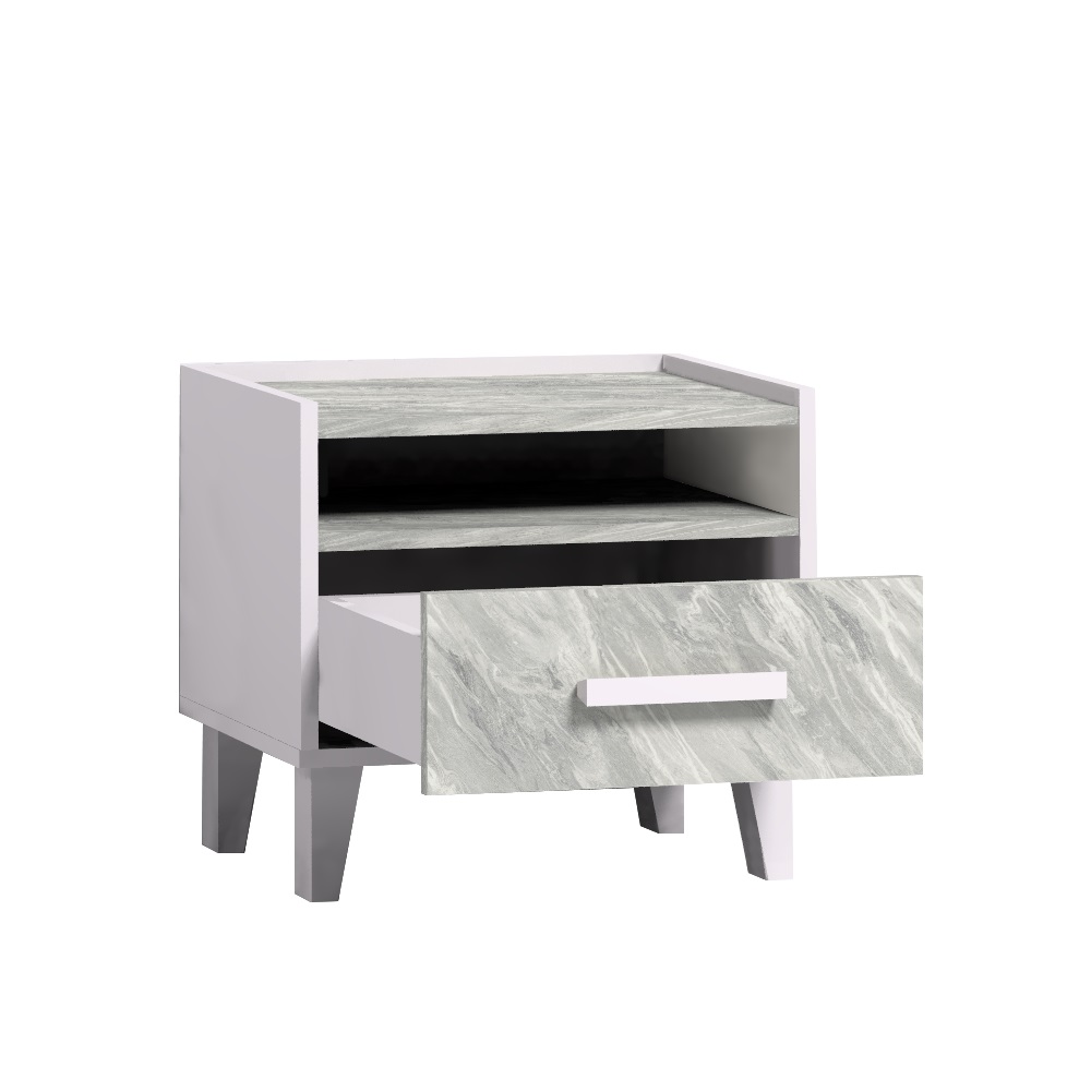 Прикроватная тумба гармонично дополняет мебельный гарнитур в спальне. В поисках тумбы в современном стиле рекомендуем обратить внимание на Айрис. Модель на высоких ножках - это практичное решение для хранения мелочей, которые необходимо иметь под рукой перед сном и с утра после пробуждения. Декор "статуарио" имитирует текстуру камня и прекрасно сочетается с белым корпусом модуля.
