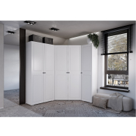 Вместительный шкаф угловой конфигурации с широкой стационарной штангой и комплектом полок. Идеально сочетается с остальными шкафами коллекции Софт в составе шкафной группы.
