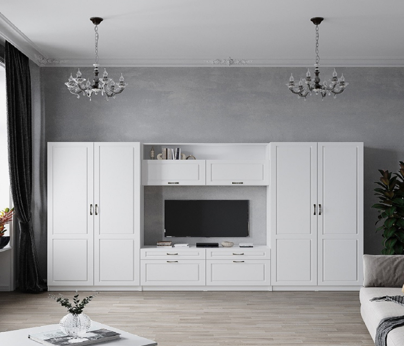 Модульная коллекция Апполия – идеальное решение для тех, кто любит классическую обстановку. Корпус мебели выполнен из ЛДСП в белом цвете с тиснением, фрезерованный фасад – из МДФ в пленке ПВХ. Уточненные ручки, надежная фурнитура и возможность укомплектовать шкафы карнизом – несомненные преимущества серии.