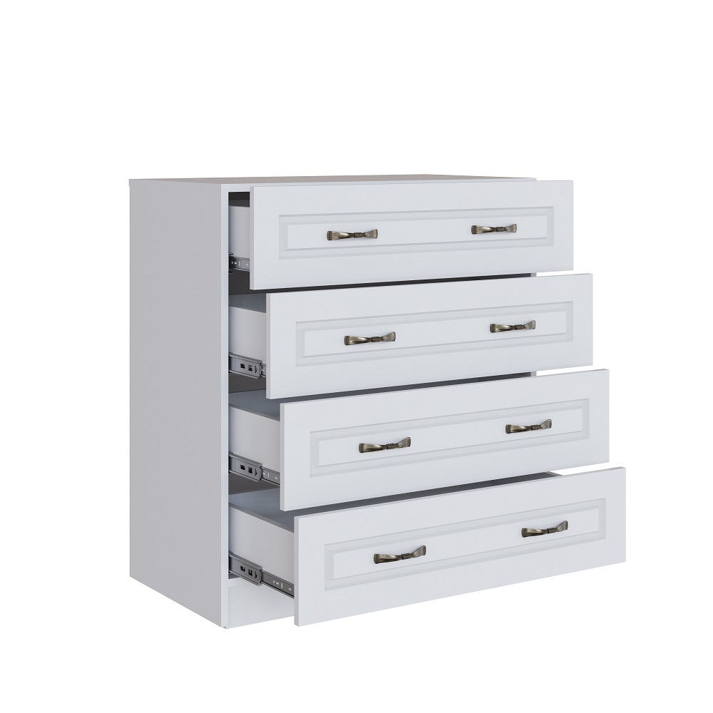 Комод Апполия выполнен в классическом стиле: сочетание белого цвета с тиснением с белым дубом, фрезерованные фасады, элегантные ручки. Ящики оснащены направляющими полного и плавного выдвижения.