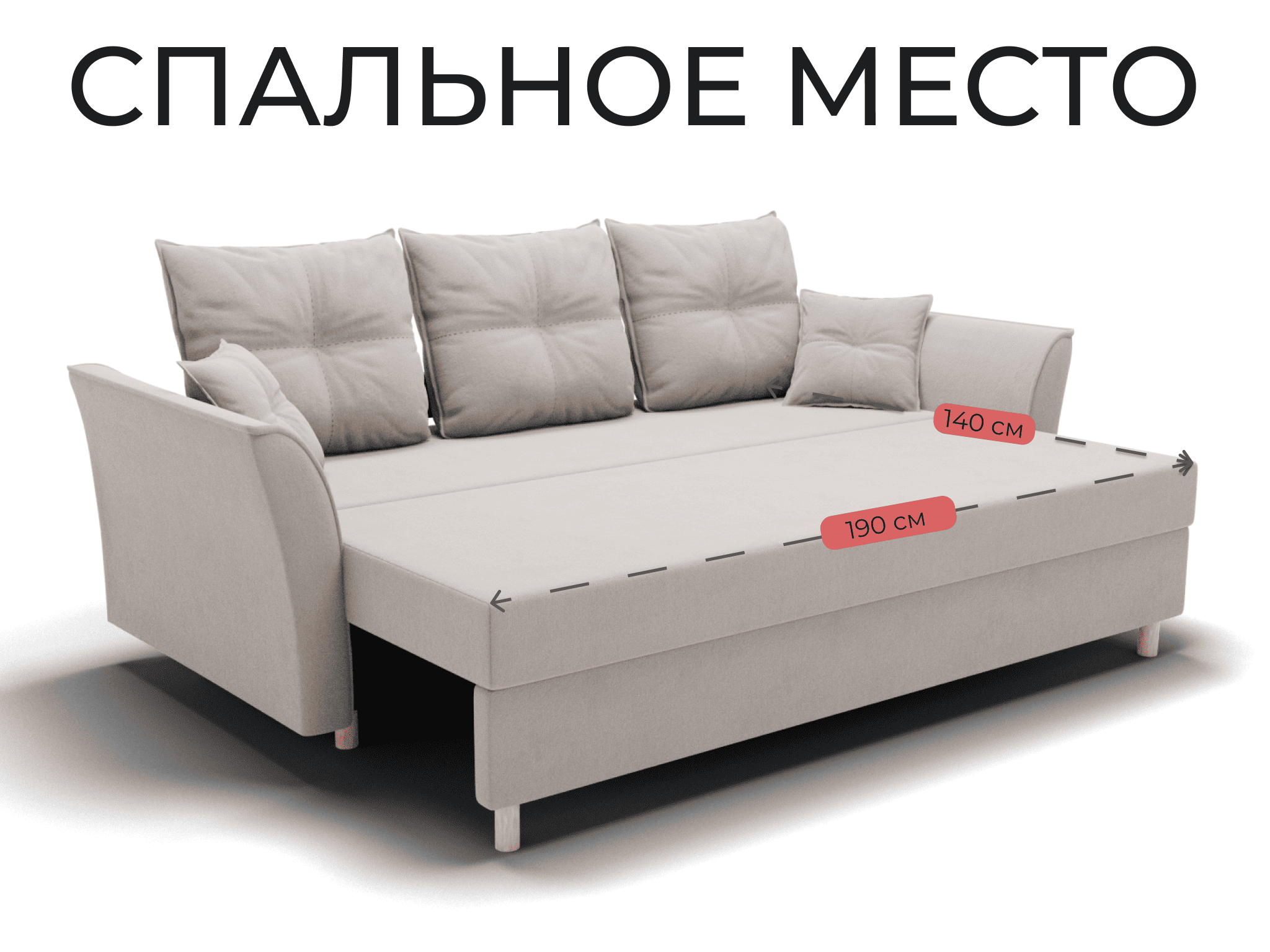 Спальное место: ширина - 140 см, длина - 190 см. Максимальная нагрузка - 250 кг.