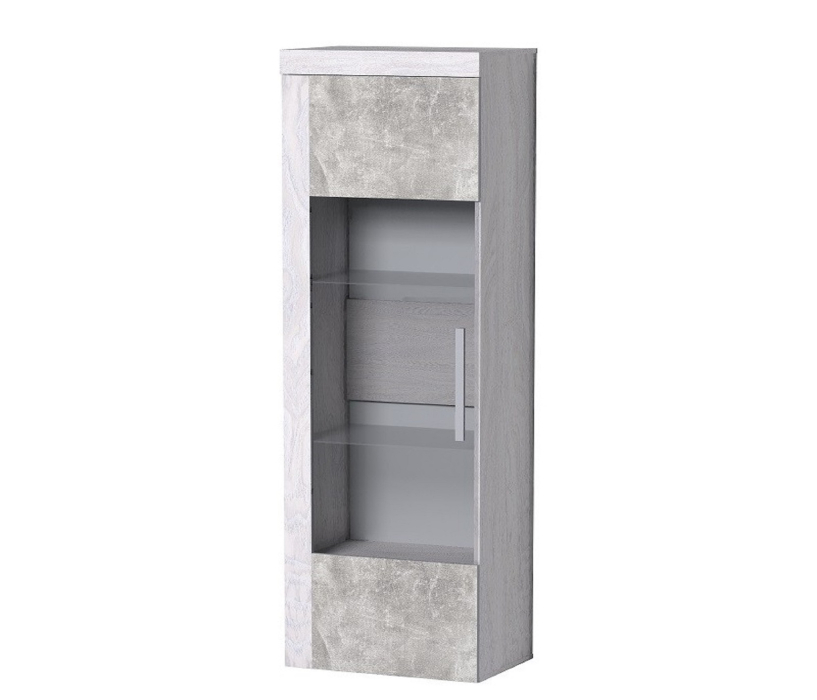 Посудный шкаф со стеклянной дверцей позволит выставить в гостиной те коллекционные и памятные вещицы, которыми вы дорожите. Стеклополки в обработке еврокромкой выдерживают до 10 кг каждая. Их можно декоративно подсветить с помощью светодиоднойBerlin 5 Подсветка(в комплекте не поставляется, приобретается отдельно). Фасад перенавешивается на левую и правую сторону. Серебристая стильная ручка из массива дерева и серое тонирование стекло фасада вносят смелые дизайнерские штрихи в восприятии актуальноого декора "под бетон".