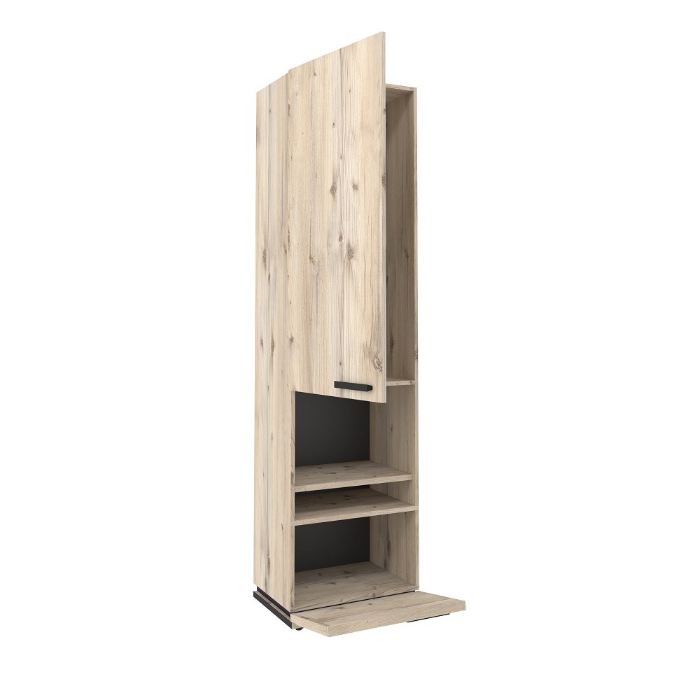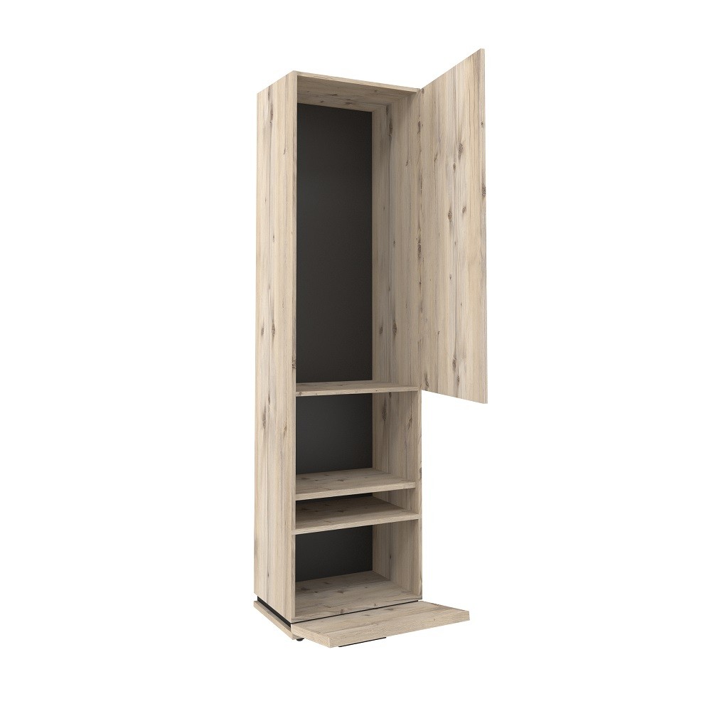 Благородный древесный оттенок шкафа, контрастирующий с черными ручками из массива дерева, подойдет к большинству цветовых решений – мебель будет легко комбинировать с другими предметами. Высокий шкаф МЦН удобен своей функциональностью и эргономичностью конструкции. На открытой полке разместите фотографии или элементы декора, а за глухими фасадами спрячьте документы и ценные вещи от посторонних глаз. Регулируемые опоры шкафа позволят компенсировать незначительные неровности пола.
