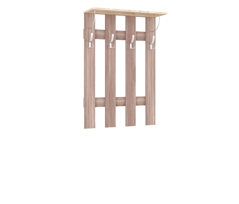 Вешалка состоит из панелей ЛДСП, соединенных между собой надежными креплениями, 4-х крючков и открытой полки-антресоли.